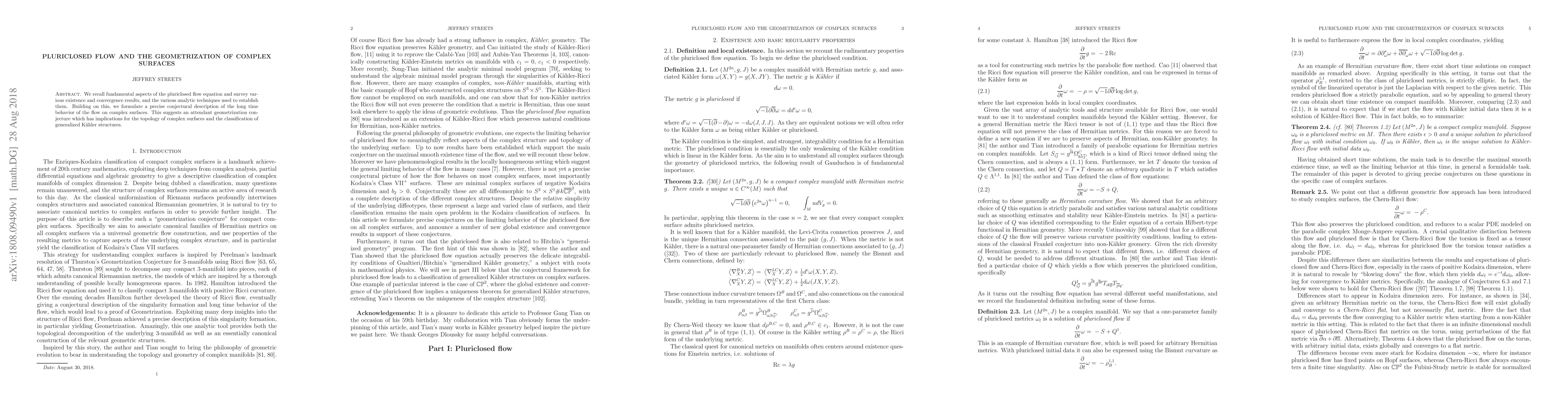 We recall fundamental aspects of the pluriclosed flow equation and survey various existence and convergence results, and the various analytic techniques used to establish them. Building on this, we formulate a precise conjectural description of the long time behavior of the flow on complex surfaces. This suggests an attendant geometrization conjecture which has implications for the topology of complex surfaces and the classification of generalized K\"ahler structures.