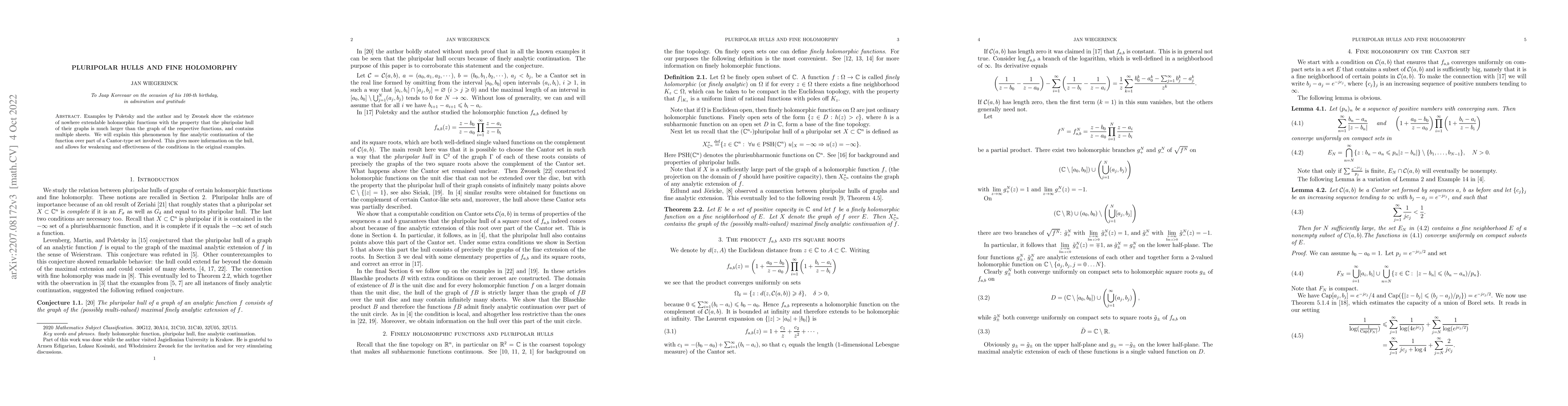 This paper explores holomorphic functions whose pluripolar hulls are significantly larger than their graphs, containing multiple sheets, and explains this phenomenon through fine analytic continuation over Cantor-type sets, enhancing the understanding and effectiveness of the conditions in previous examples.