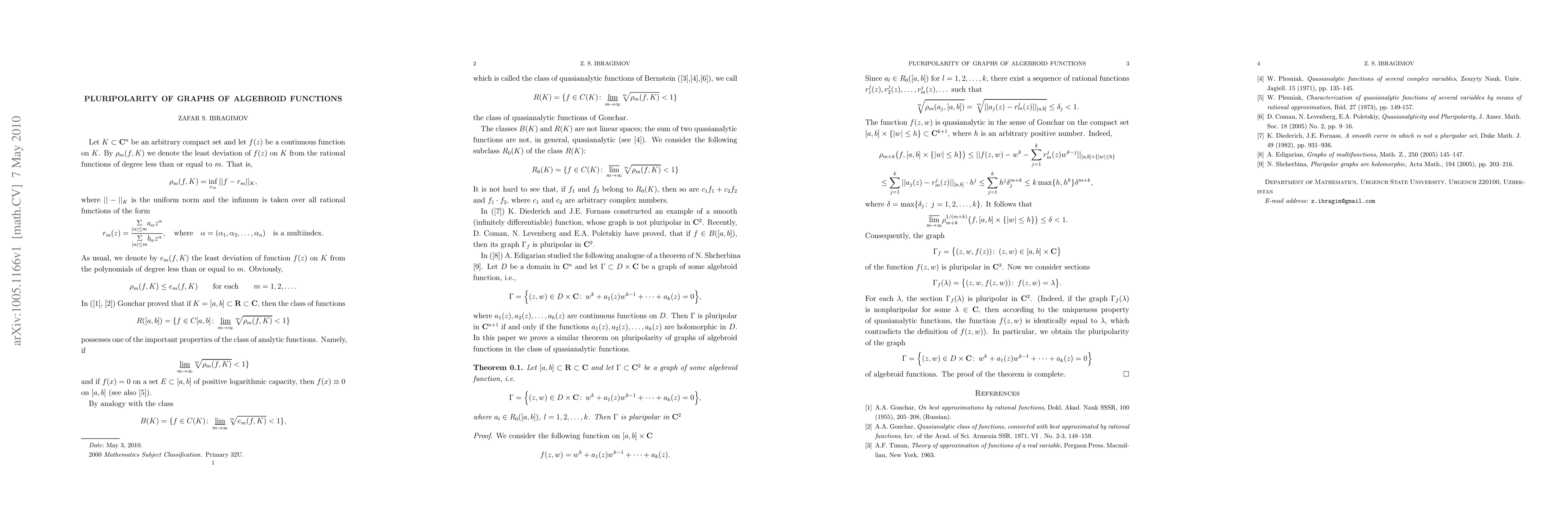Summary: This paper proves that the graphs of algebroid functions exhibit pluripolarity, a property indicating that the function's graph can be covered by a collection of polar sets. This finding contributes to the understanding of the geometric properties of algebroid functions.