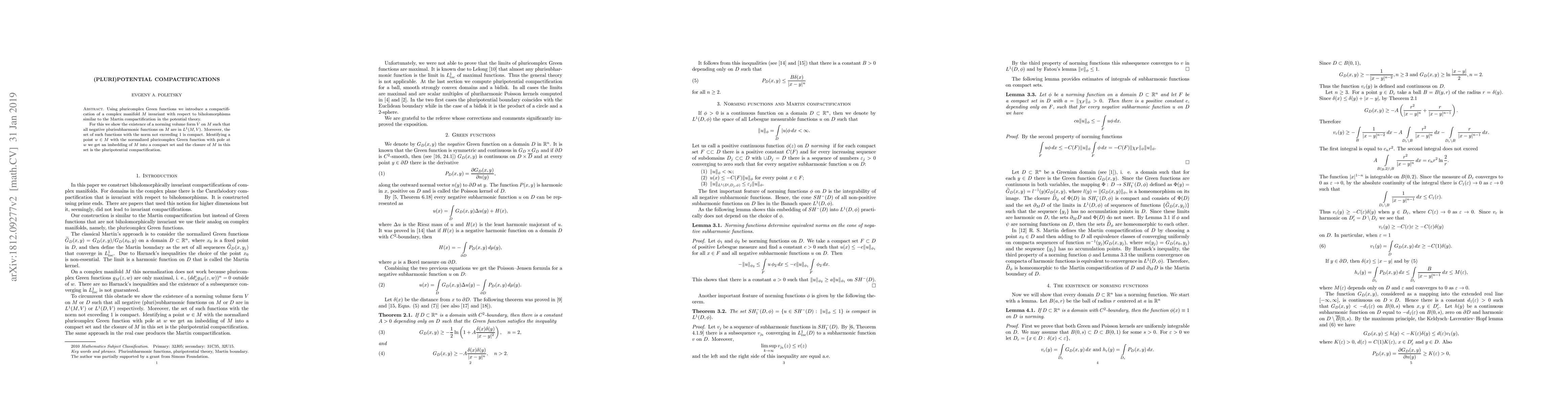 Using pluricomplex Green functions we introduce a compactification of a complex manifold $M$ invariant with respect to biholomorphisms similar to the Martin compactification in the potential theory. For this we show the existence of a norming volume form $V$ on $M$ such that all negative plurisubharmonic functions on $M$ are in $L^1(M,V)$. Moreover, the set of such functions with the norm not exceeding 1 is compact. Identifying a point $w\in M$ with the normalized pluricomplex Green function with pole at $w$ we get an imbedding of $M$ into a compact set and the closure of $M$ in this set is the pluripotential compactification.