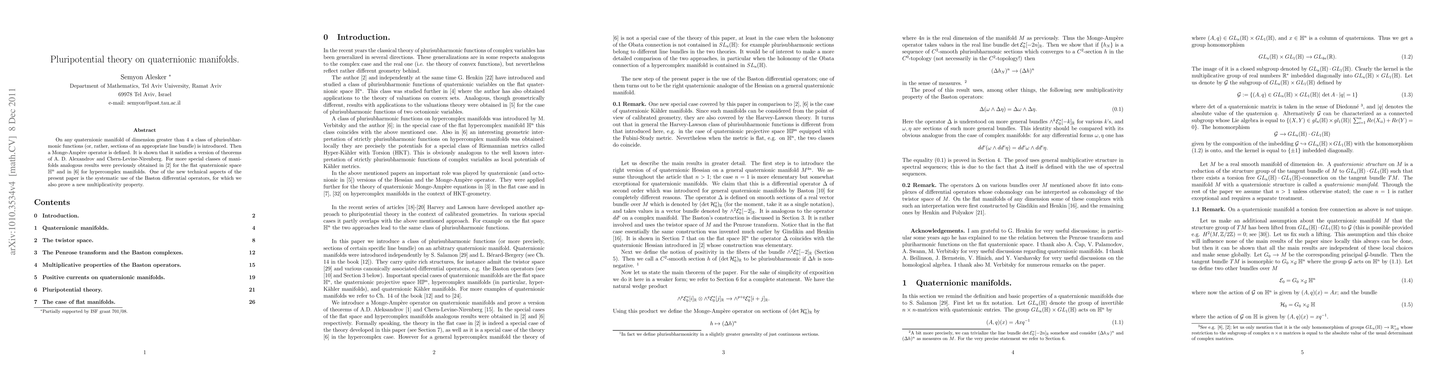 This paper introduces plurisubharmonic functions on quaternionic manifolds and defines a Monge-Ampère operator, proving theorems analogous to those of Alexandrov and Chern-Levine-Nirenberg. It employs Baston differential operators, establishing a new multiplicativity property for technical advancements.