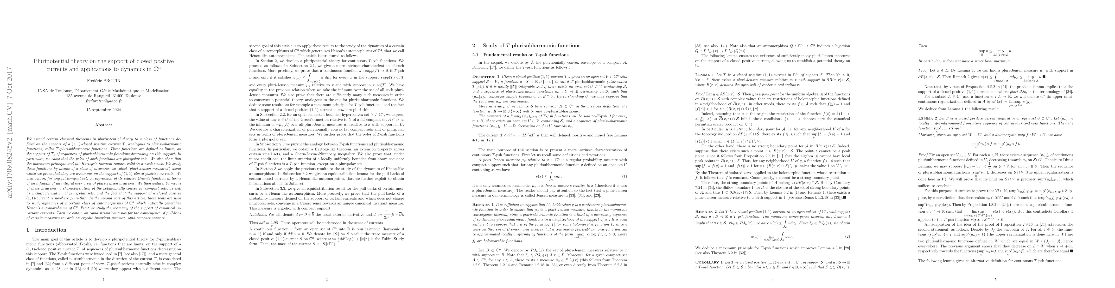 We extend certain classical theorems in pluripotential theory to a class of functions defined on the support of a $(1,1)$-closed positive current $T$, analogous to plurisubharmonic functions, called $T$-plurisubharmonic functions. These functions are defined as limits, on the support of $T$, of sequences of plurisubharmonic functions decreasing on this support. In particular, we show that the poles of such functions are pluripolar sets. We also show that the maximum principle and the Hartogs's theorem remain valid in a weak sense. We study these functions by means of a class of measures, so-called "pluri-Jensen measures", about which we prove that they are numerous on the support of $(1,1)$-closed positive currents. We also obtain, for any fat compact set, an expression of its relative Green's function in terms of an infimum of an integral over a set of pluri-Jensen measures. We then deduce, by means of these measures, a characterization of the polynomially convex fat compact sets, as well as a characterization of pluripolar sets, and the fact that the support of a closed positive $(1,1)$-current is nowhere pluri-thin. In the second part of this article, these tools are used to study dynamics of a certain class of automorphisms of $\mathbb{C}^n$ which naturally generalize H\'enon's automorphisms of $\mathbb{C}^2$. First we study the geometry of the support of canonical invariant currents. Then we obtain an equidistribution result for the convergence of pull-back of certain measures towards an ergodic invariant measure, with compact support.