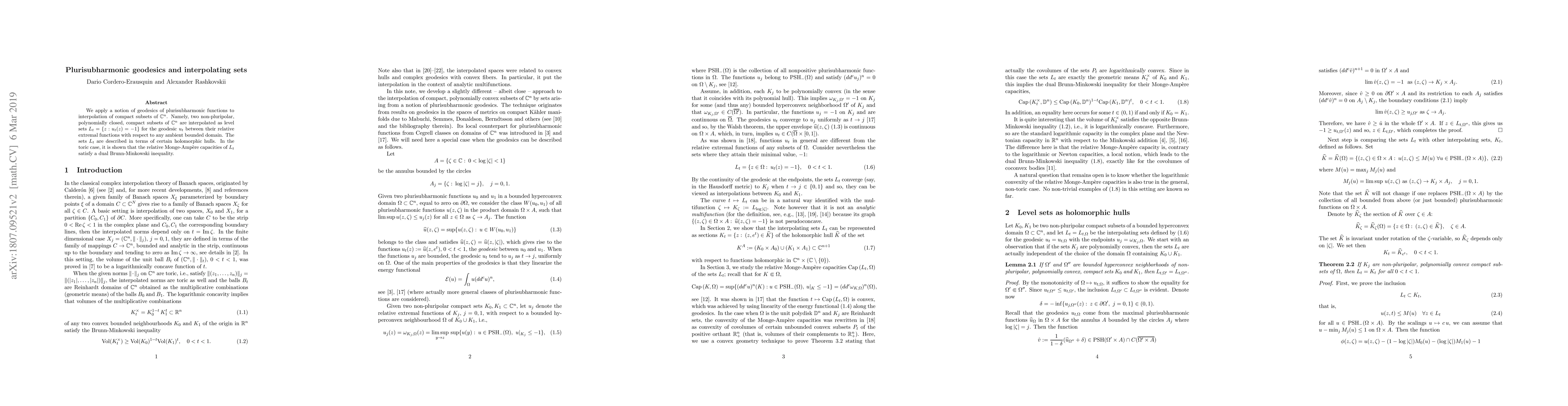 We apply a notion of geodesics of plurisubharmonic functions to interpolation of compact subsets of $C^n$. Namely, two non-pluripolar, polynomially closed, compact subsets of $C^n$ are interpolated as level sets $L_t=\{z: u_t(z)=-1\}$ for the geodesic $u_t$ between their relative extremal functions with respect to any ambient bounded domain. The sets $L_t$ are described in terms of certain holomorphic hulls. In the toric case, it is shown that the relative Monge-Amp\`ere capacities of $L_t$ satisfy a dual Brunn-Minkowski inequality.