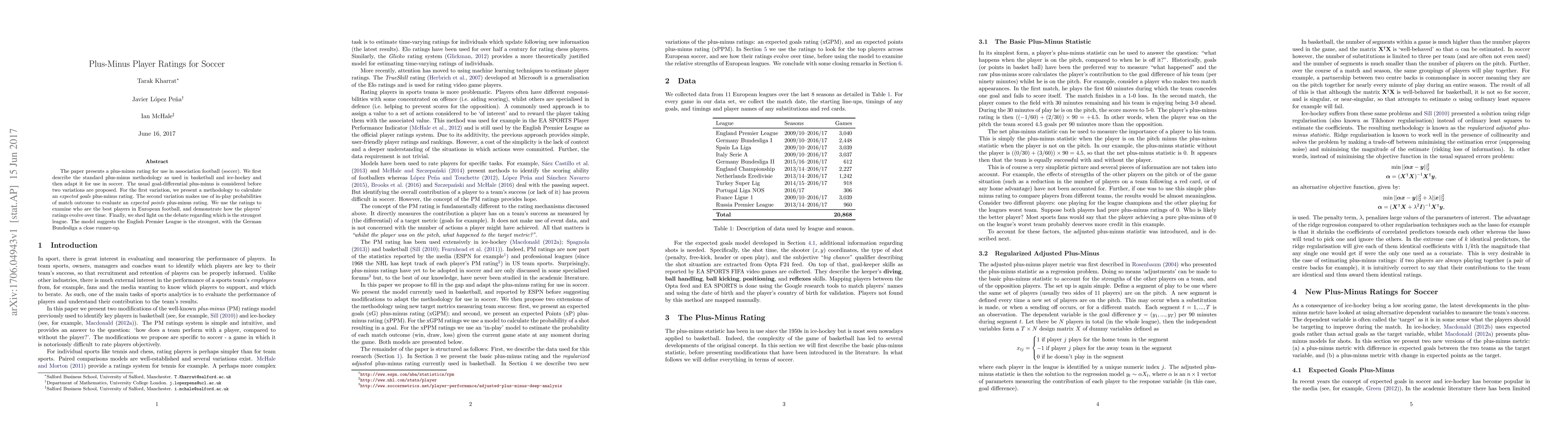 This paper adapts the plus-minus rating methodology from basketball and ice-hockey for soccer, proposing expected goals and expected points plus-minus ratings to evaluate player performance, and identifies the English Premier League as the strongest league based on these metrics.
