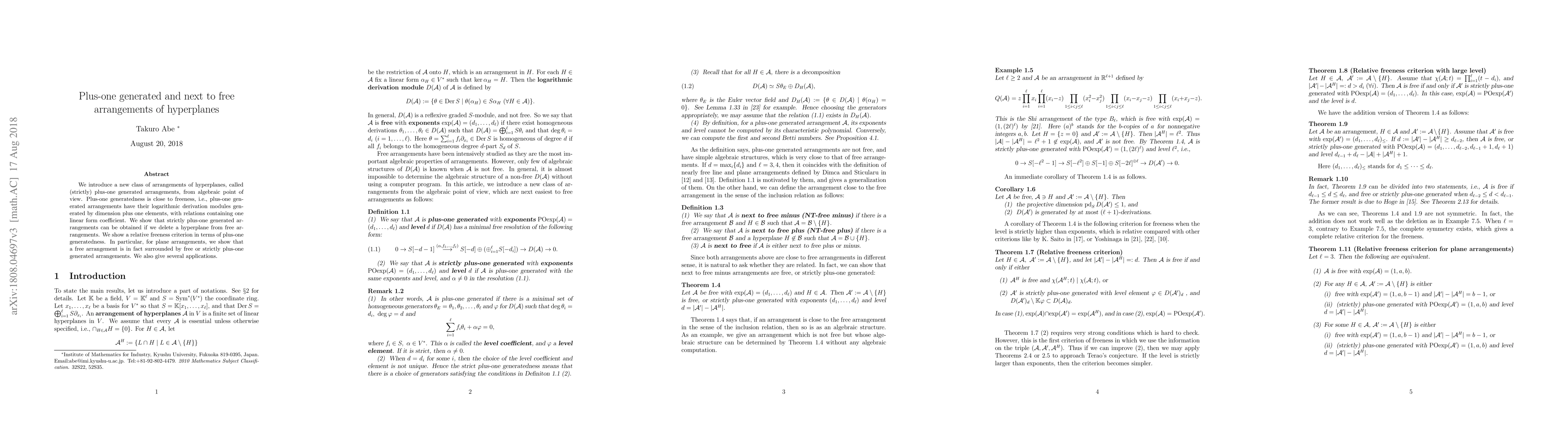 We introduce a new class of arrangements of hyperplanes, called (strictly) plus-one generated arrangements, from algebraic point of view. Plus-one generatedness is close to freeness, i.e., plus-one generated arrangements have their logarithmic derivation modules generated by dimension plus one elements, with relations containing one linear form coefficient. We show that strictly plus-one generated arrangements can be obtained if we delete a hyperplane from free arrangements. We show a relative freeness criterion in terms of plus-one generatedness. In particular, for plane arrangements, we show that a free arrangement is in fact surrounded by free or strictly plus-one generated arrangements. We also give several applications.