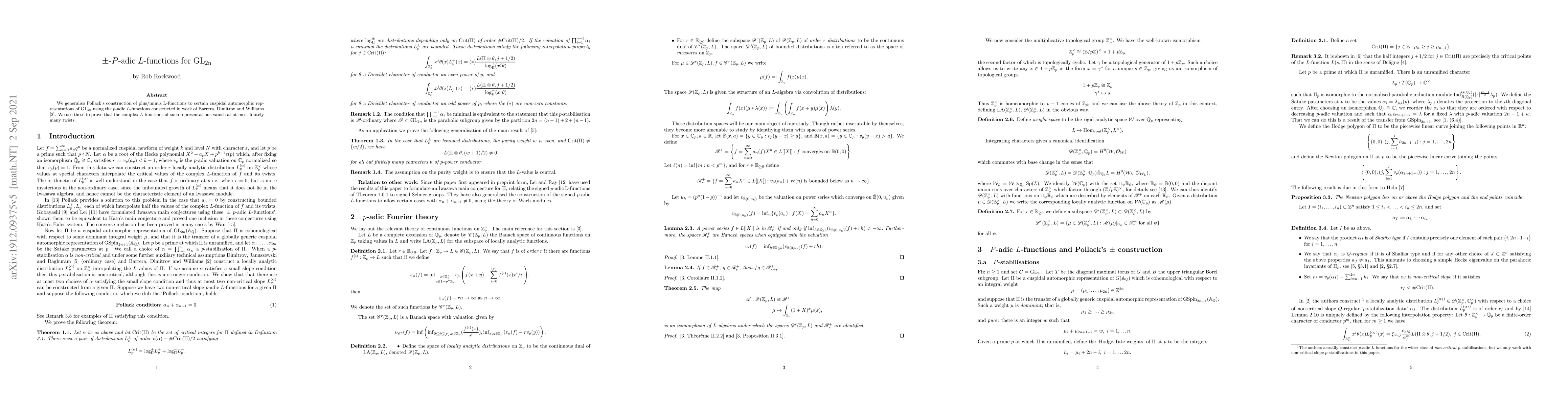 We generalise Pollack's construction of plus/minus L-functions to certain cuspidal automorphic representations of $\mathrm{GL}_{2n}$ using the $p$-adic $L$-functions constructed in forthcoming work of Barrera, Dimitrov and Williams.