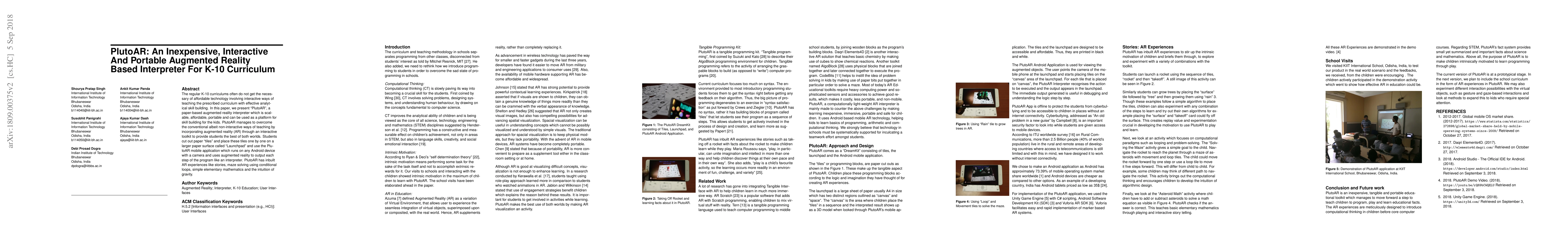 PlutoAR is an affordable, portable augmented reality tool designed to enhance K-10 curriculum through interactive learning experiences. It uses paper tiles and a mobile app to provide students with engaging AR-based skill-building activities.