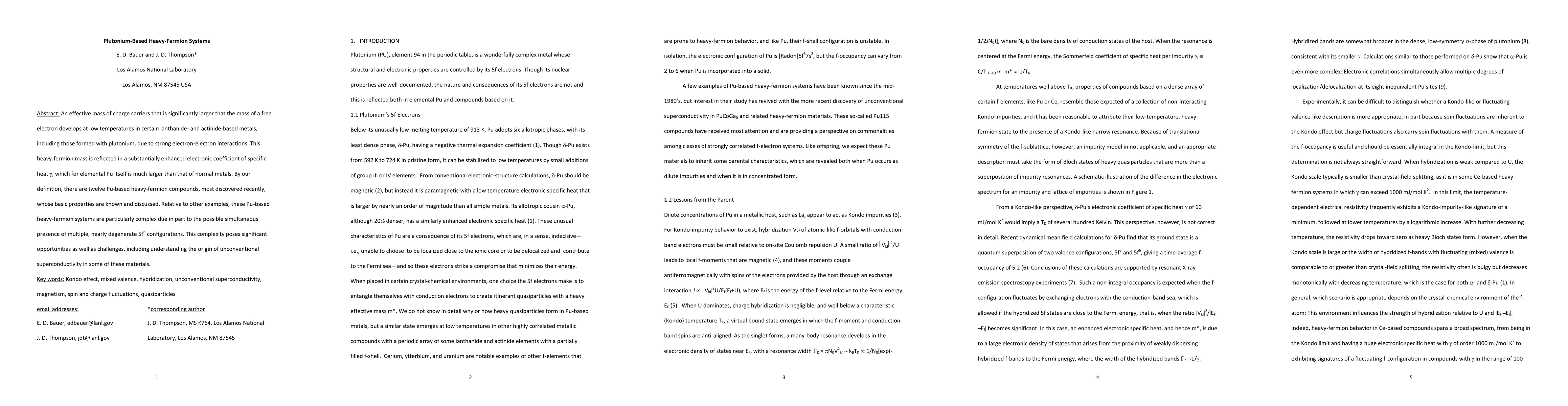 This paper explores the phenomenon of heavy-fermion behavior in plutonium-based compounds, characterized by significantly enhanced effective mass of charge carriers due to strong electron-electron interactions. These systems, with twelve identified Pu-based examples, present unique complexities and potential for understanding unconventional superconductivity.