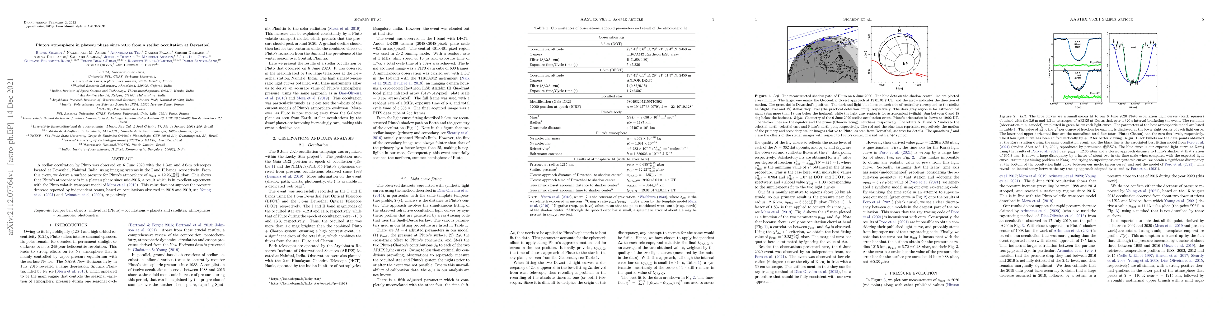A stellar occultation by Pluto was observed on 6 June 2020 with the 1.3-m and 3.6-m telescopes located at Devasthal, Nainital, India, using imaging systems in the I and H bands, respectively. From this event, we derive a surface pressure for Pluto's atmosphere of $p_{\rm surf}= 12.23^{+0.65}_{-0.38} $~$\mu$bar. This shows that Pluto's atmosphere is in a plateau phase since mid-2015, a result which is in excellent agreement with the Pluto volatile transport model of Meza et al. (2019}. This value does not support the pressure decrease reported by independent teams, based on occultations observed in 2018 and 2019, see Young et al. (2021} and Arimatu et al. (2020), respectively.