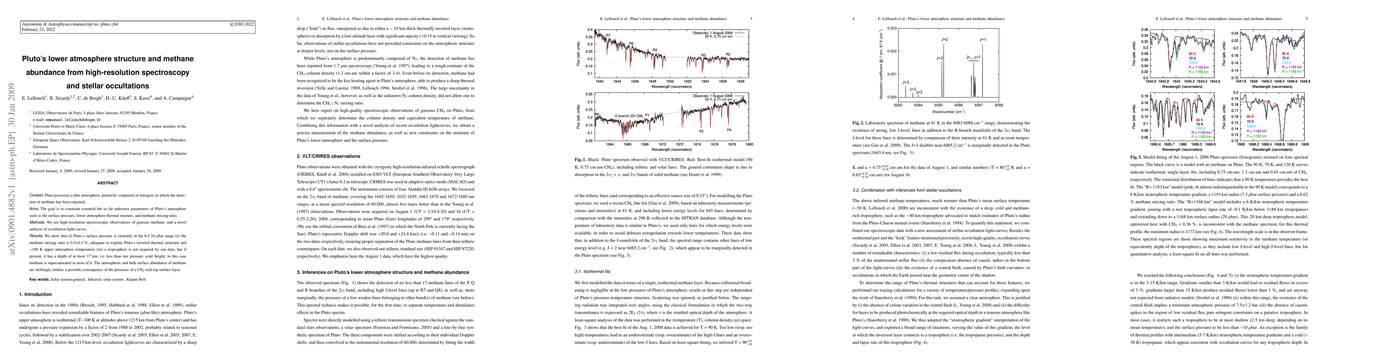 This study uses high-resolution spectroscopy and stellar occultations to determine Pluto's surface pressure (6.5-24 microbars), methane mixing ratio (0.5±0.1%), and finds no evidence for a deep troposphere, suggesting a possible CH4-rich surface layer.