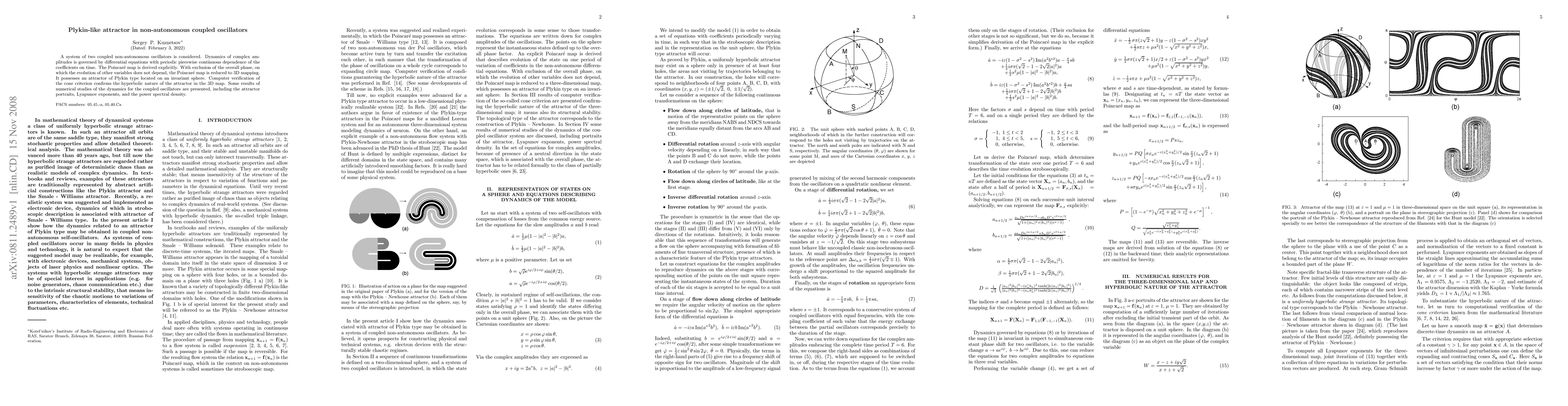 The paper examines a system of two interacting, time-varying oscillators, deriving an explicit Poincaré map. It identifies a Plykin-type attractor within a 3D invariant sphere, confirmed as hyperbolic via the cone criterion. Numerical simulations reveal attractor portraits, Lyapunov exponents, and power spectral density for these coupled oscillators.