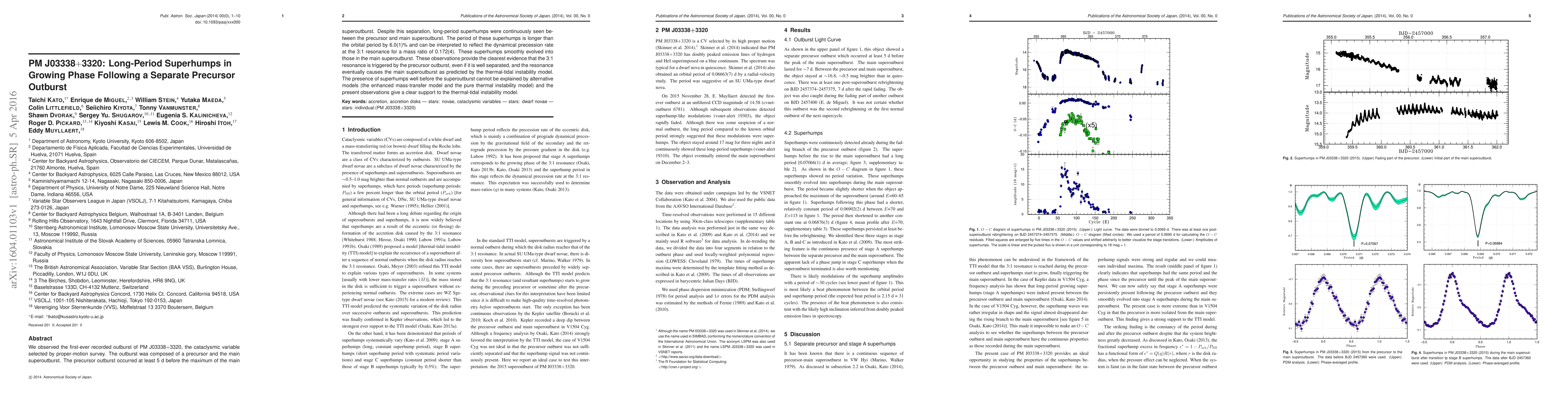 The paper presents observations of the first outburst of cataclysmic variable PM J03338+3320, divided into a precursor and main superoutburst. Long-period superhumps were continuously observed between these outbursts, evolving into those in the main superoutburst. This suggests the 3:1 resonance, triggered by the precursor, causes the main superoutburst, supporting the thermal-tidal instability model.