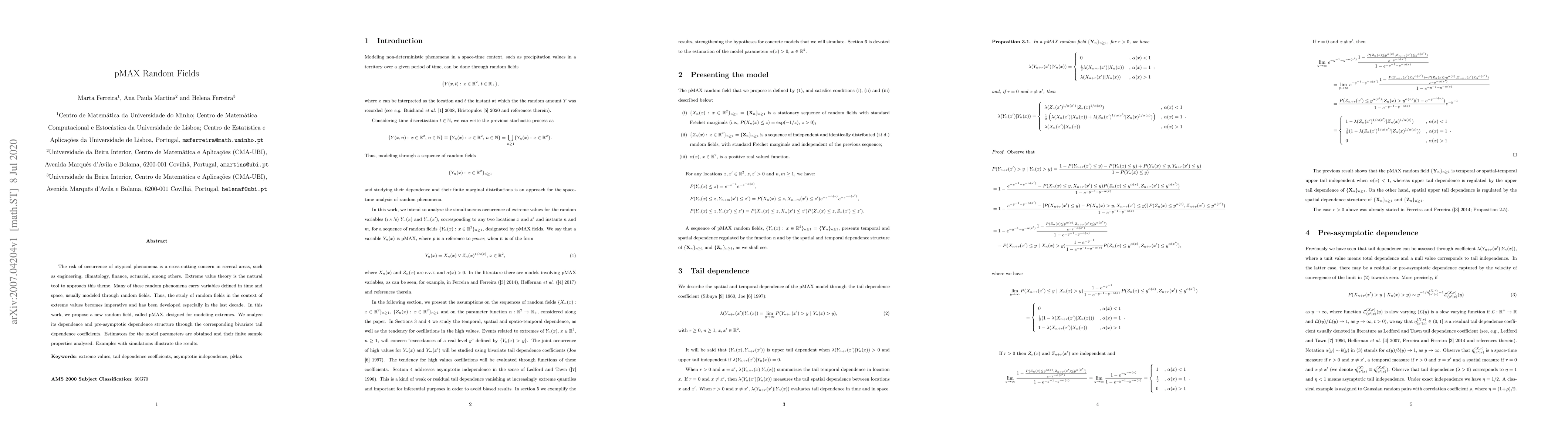 The risk of occurrence of atypical phenomena is a cross-cutting concern in several areas, such as engineering, climatology, finance, actuarial, among others. Extreme value theory is the natural tool to approach this theme. Many of these random phenomena carry variables defined in time and space, usually modeled through random fields. Thus, the study of random fields in the context of extreme values becomes imperative and has been developed especially in the last decade. In this work, we propose a new random field, called pMAX, designed for modeling extremes. We analyze its dependence and pre-asymptotic dependence structure through the corresponding bivariate tail dependence coefficients. Estimators for the model parameters are obtained and their finite sample properties analyzed. Examples with simulations illustrate the results.