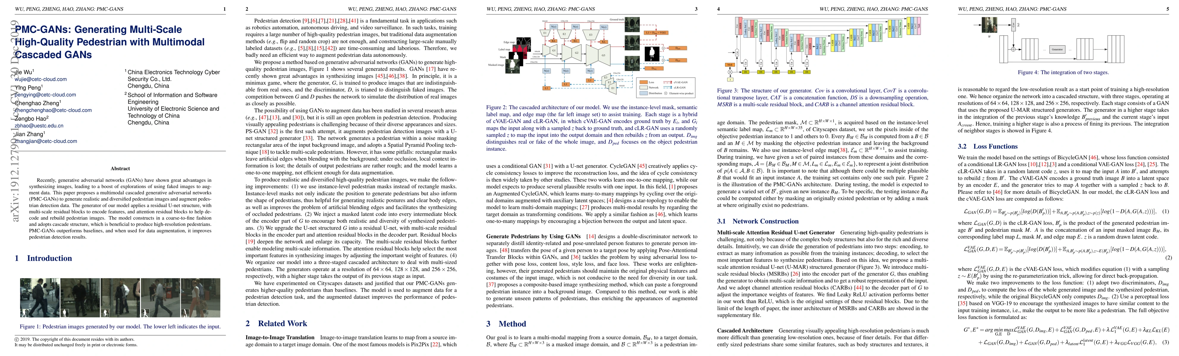 This paper introduces PMC-GANs, a multimodal cascaded GAN that employs a residual U-net with multi-scale and attention residual blocks to generate high-quality, realistic pedestrian images. The model's coarse-to-fine cascade structure enhances resolution and augments pedestrian detection data, improving detection results.