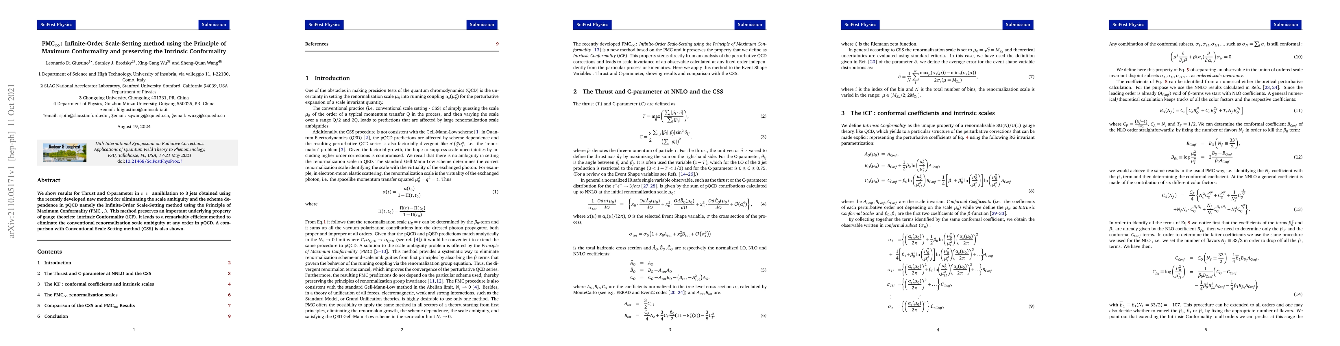 We show results for Thrust and C-parameter in $e^+ e^-$ annihilation to 3 jets obtained using the recently developed new method for eliminating the scale ambiguity and the scheme dependence in pQCD namely the Infinite-Order Scale-Setting method using the Principle of Maximum Conformality (PMC$_\infty$). This method preserves an important underlying property of gauge theories: intrinsic Conformality (iCF). It leads to a remarkably efficient method to eliminate the conventional renormalization scale ambiguity at any order in pQCD. A comparison with Conventional Scale Setting method (CSS) is also shown.