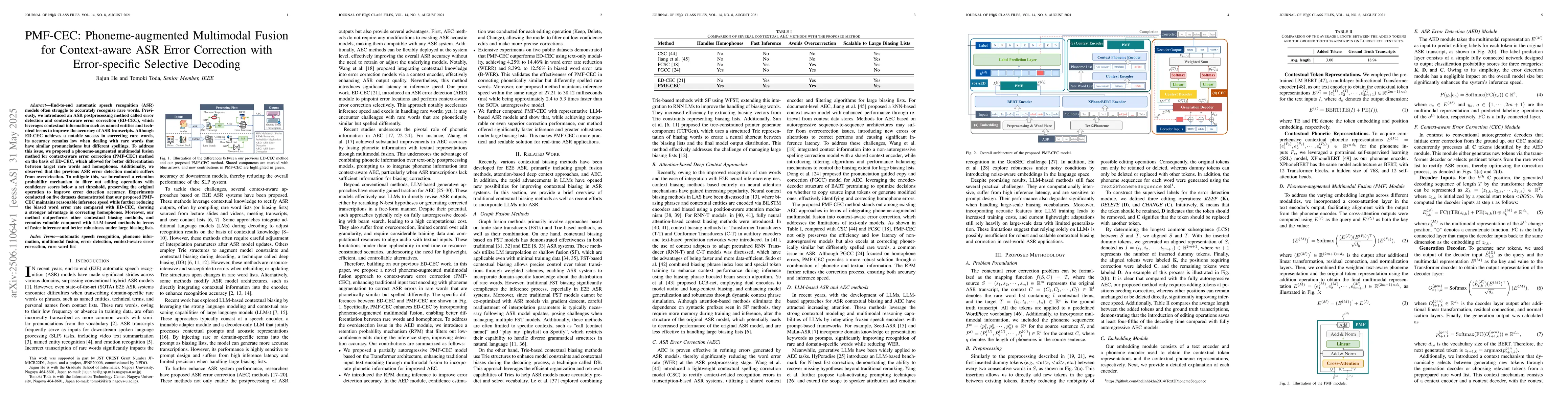 End-to-end automatic speech recognition (ASR) models often struggle to accurately recognize rare words. Previously, we introduced an ASR postprocessing method called error detection and context-aware error correction (ED-CEC), which leverages contextual information such as named entities and technical terms to improve the accuracy of ASR transcripts. Although ED-CEC achieves a notable success in correcting rare words, its accuracy remains low when dealing with rare words that have similar pronunciations but different spellings. To address this issue, we proposed a phoneme-augmented multimodal fusion method for context-aware error correction (PMF-CEC) method on the basis of ED-CEC, which allowed for better differentiation between target rare words and homophones. Additionally, we observed that the previous ASR error detection module suffers from overdetection. To mitigate this, we introduced a retention probability mechanism to filter out editing operations with confidence scores below a set threshold, preserving the original operation to improve error detection accuracy. Experiments conducted on five datasets demonstrated that our proposed PMF-CEC maintains reasonable inference speed while further reducing the biased word error rate compared with ED-CEC, showing a stronger advantage in correcting homophones. Moreover, our method outperforms other contextual biasing methods, and remains valuable compared with LLM-based methods in terms of faster inference and better robustness under large biasing lists.