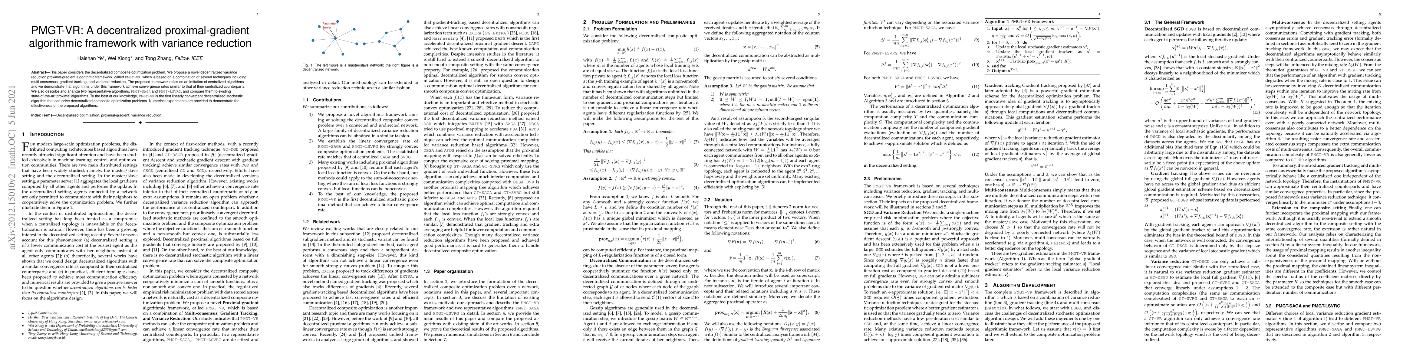 This paper introduces PMGT-VR, a decentralized variance-reduction proximal-gradient framework combining multi-consensus and gradient tracking techniques. It demonstrates linear convergence and compares two algorithms, PMGT-SAGA and PMGT-LSVRG, to state-of-the-art methods, showing their effectiveness through numerical experiments.
