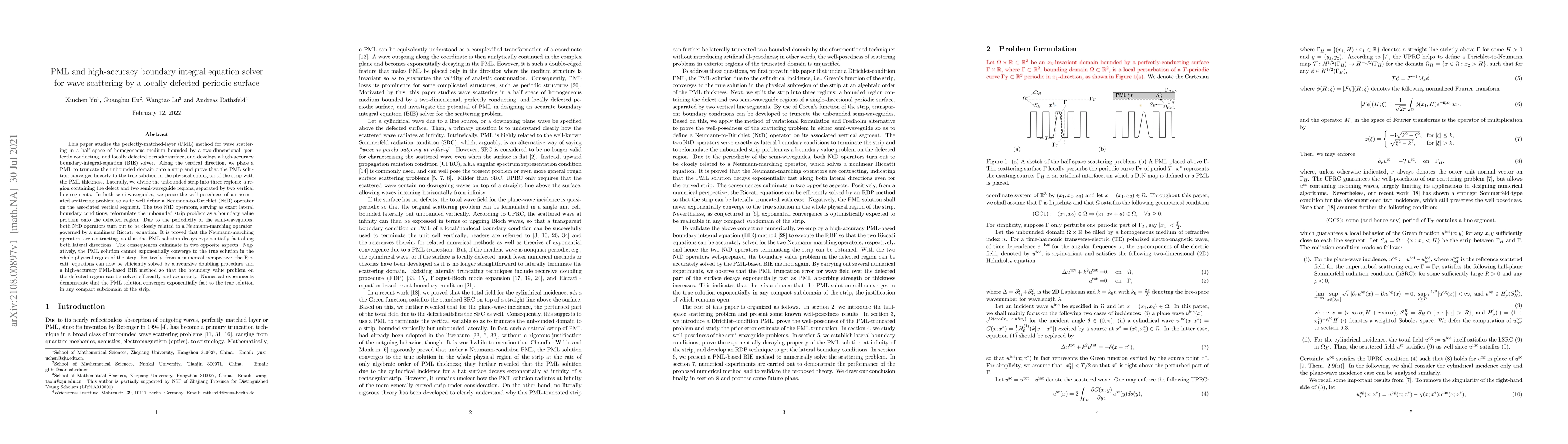This paper studies the PML method for wave scattering in a half space of homogeneous medium bounded by a two-dimensional, perfectly conducting, and locally defected periodic surface, and develops a high-accuracy boundary-integral-equation (BIE) solver. Along the vertical direction, we place a PML to truncate the unbounded domain onto a strip and prove that the PML solution converges linearly to the true solution in the physical subregion of the strip with the PML thickness. Laterally, we divide the unbounded strip into three regions: a region containing the defect and two semi-waveguide regions, separated by two vertical line segments. In both semi-waveguides, we prove the well-posedness of an associated scattering problem so as to well define a Neumann-to-Dirichlet (NtD) operator on the associated vertical segment. The two NtD operators, serving as exact lateral boundary conditions, reformulate the unbounded strip problem as a boundary value problem onto the defected region. Due to the periodicity of the semi-waveguides, both NtD operators turn out to be closely related to a Neumann-marching operator, governed by a nonlinear Riccati equation. It is proved that the Neumann-marching operators are contracting, so that the PML solution decays exponentially fast along both lateral directions. The consequences culminate in two opposite aspects. Negatively, the PML solution cannot exponentially converge to the true solution in the whole physical region of the strip. Positively, from a numerical perspective, the Riccati equations can now be efficiently solved by a recursive doubling procedure and a high-accuracy PML-based BIE method so that the boundary value problem on the defected region can be solved efficiently and accurately. Numerical experiments demonstrate that the PML solution converges exponentially fast to the true solution in any compact subdomain of the strip.