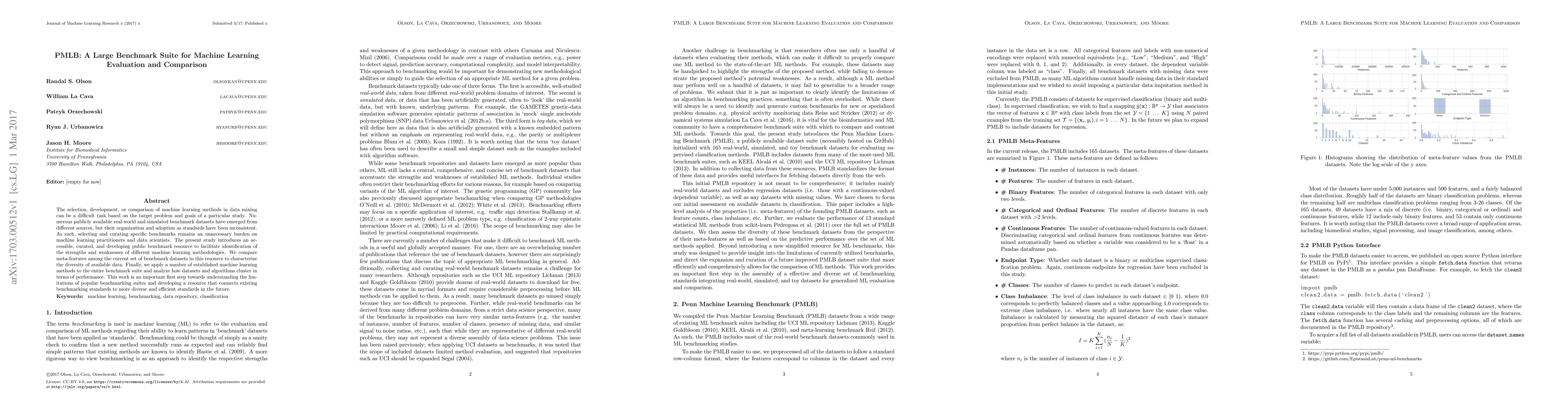 The selection, development, or comparison of machine learning methods in data mining can be a difficult task based on the target problem and goals of a particular study. Numerous publicly available real-world and simulated benchmark datasets have emerged from different sources, but their organization and adoption as standards have been inconsistent. As such, selecting and curating specific benchmarks remains an unnecessary burden on machine learning practitioners and data scientists. The present study introduces an accessible, curated, and developing public benchmark resource to facilitate identification of the strengths and weaknesses of different machine learning methodologies. We compare meta-features among the current set of benchmark datasets in this resource to characterize the diversity of available data. Finally, we apply a number of established machine learning methods to the entire benchmark suite and analyze how datasets and algorithms cluster in terms of performance. This work is an important first step towards understanding the limitations of popular benchmarking suites and developing a resource that connects existing benchmarking standards to more diverse and efficient standards in the future.