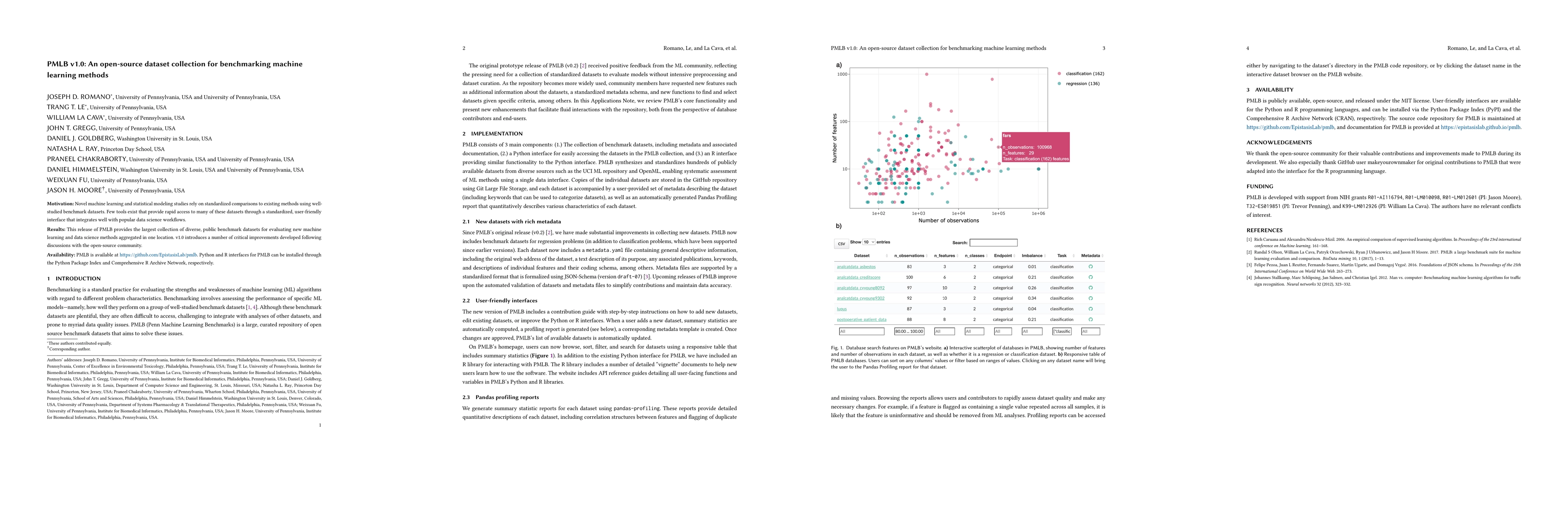 The PMLB v1.0 dataset collection provides a comprehensive platform for benchmarking machine learning methods, featuring the largest collection of diverse public datasets in one location.