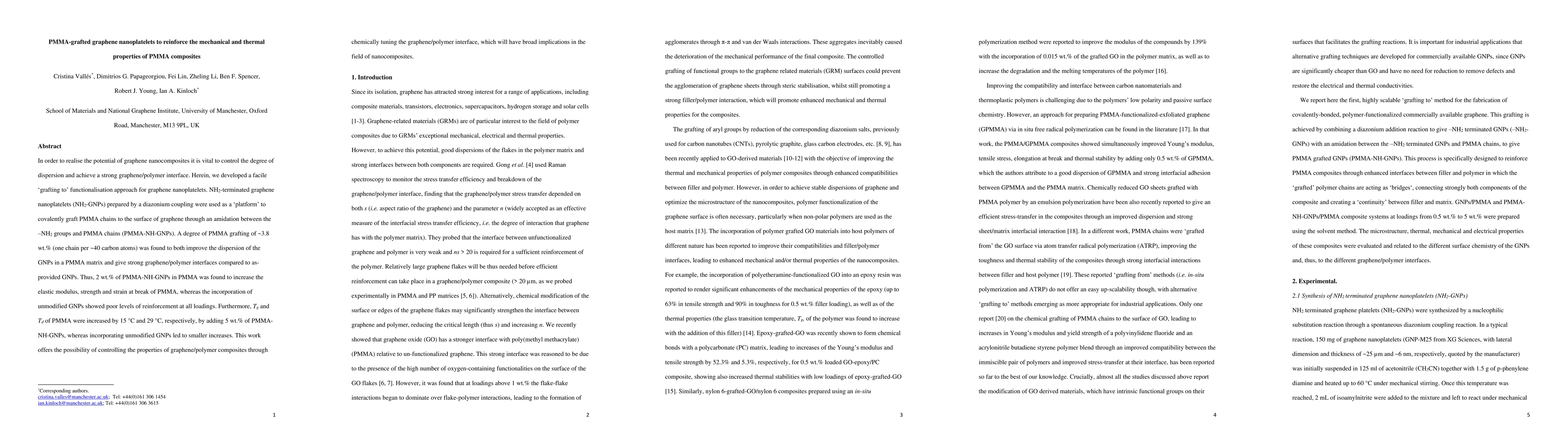 This paper develops a grafting method to covalently bond PMMA chains to NH2-terminated graphene nanoplatelets, significantly enhancing dispersion and interface strength in PMMA composites. The modified graphene nanoplatelets boost mechanical and thermal properties of PMMA, demonstrating substantial increases in elastic modulus, strength, and thermal stability compared to unmodified graphene.