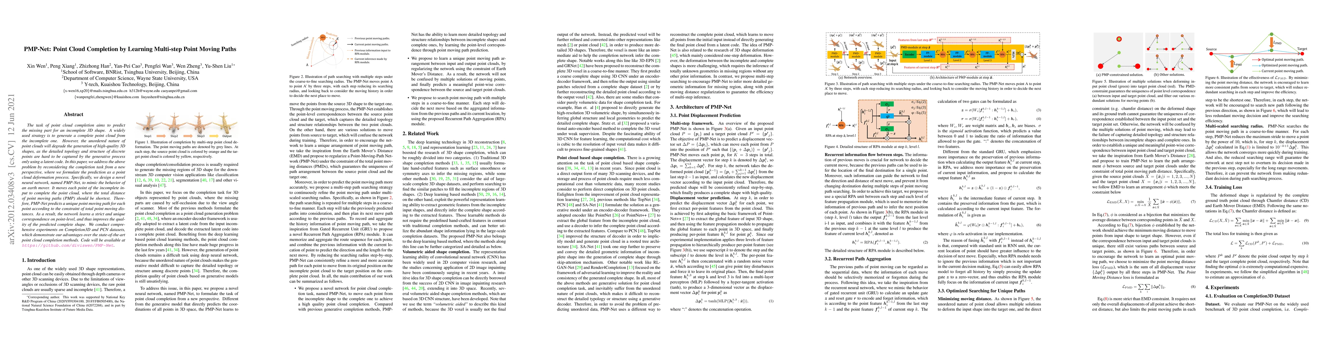 PMP-Net proposes a novel approach to point cloud completion by modeling the task as a point cloud deformation process, where each point in the incomplete cloud is moved to complete the shape, optimizing the total point moving paths for high-quality results. Experiments show PMP-Net outperforms existing methods on Completion3D and PCN datasets.