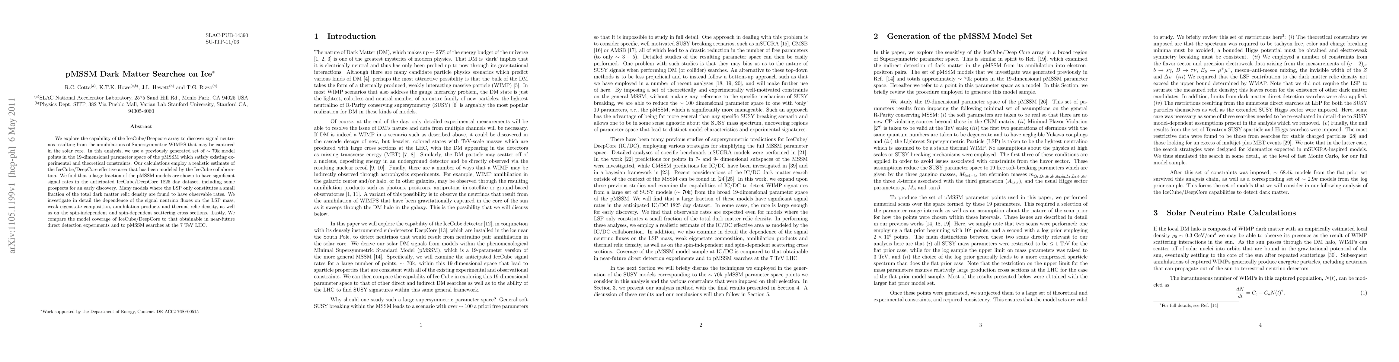 This paper examines the potential of the IceCube/DeepCore array to detect signal neutrinos from the annihilation of Supersymmetric Weakly Interacting Massive Particles (WIMPs) captured in the solar core, using a comprehensive set of pMSSM models. The study finds significant signal rates for a large fraction of these models, indicating promising prospects for early discovery, especially in scenarios where the Lightest Supersymmetric Particle (LSP) contributes a minor fraction to the dark matter density.