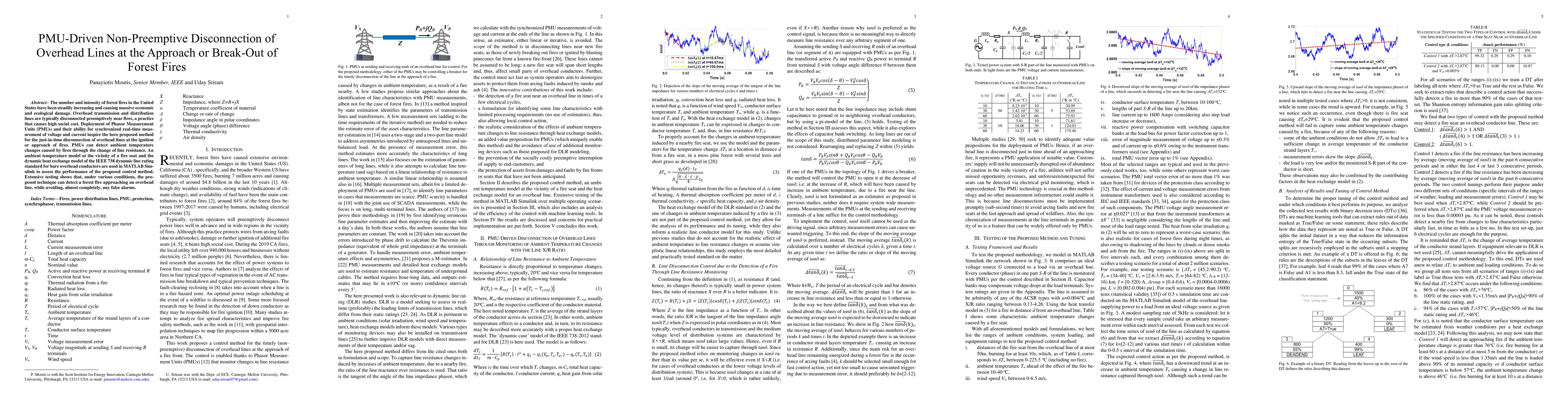 The number and intensity of forest fires in the United States have been steadily increasing and causing massive economic and ecological damage. Overhead transmission and distribution lines are typically disconnected preemptively near fires, a practice that causes high social cost. Deployment of Phasor Measurement Units (PMUs) and their ability for synchronized real-time measurement of voltage and current inspire the here proposed method for the just-in-time disconnection of overhead lines at the ignition or approach of fires. PMUs can detect ambient temperature changes caused by fires through the change of line resistance. An ambient temperature model at the vicinity of a fire seat and the dynamic heat exchange model of the IEEE 738 dynamic line rating standard for bare overhead conductors are used in MATLAB Simulink to assess the performance of the proposed control method. Extensive testing shows that, under various conditions, the proposed technique can detect a forest fire approaching an overhead line, while avoiding, almost completely, any false alarms.