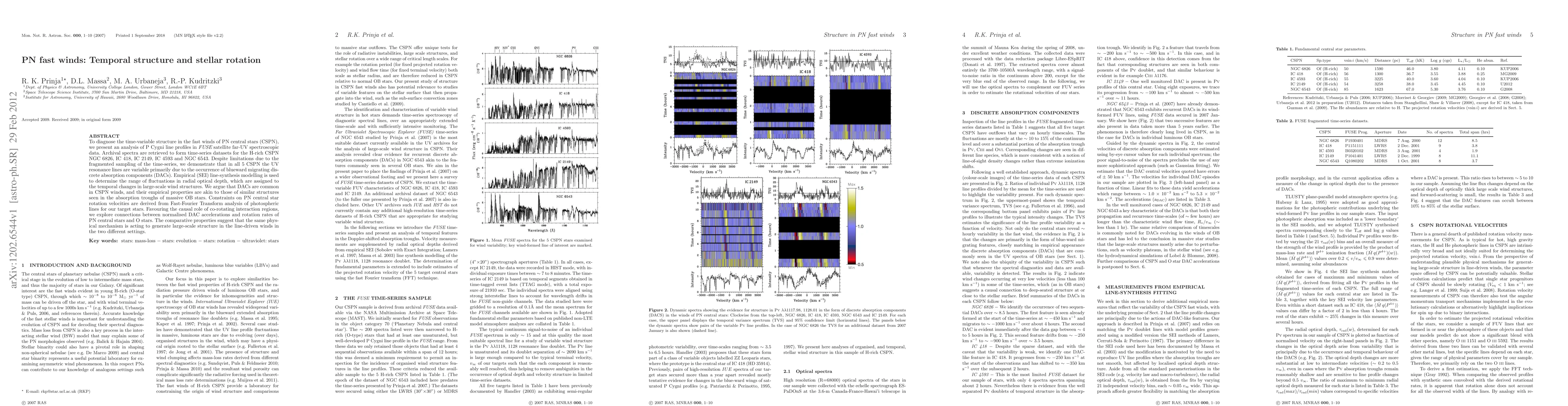 To diagnose the time-variable structure in the fast winds of central stars of planetary nebulae (CSPN), we present an analysis of P Cygni line profiles in FUSE satellite far-UV spectroscopic data. Archival spectra are retrieved to form time-series datasets for the H-rich CSPN NGC 6826, IC 418, IC 2149, IC 4593 and NGC 6543. Despite limitations due to the fragmented sampling of the time-series, we demonstrate that in all 5 CSPN the UV resonance lines are variable primarily due to the occurrence of blueward migrating discrete absorption components (DACs). Empirical (SEI) line-synthesis modelling is used to determine the range of fluctuations in radial optical depth, which are assigned to the temporal changes in large-scale wind structures. We argue that DACs are common in CSPN winds, and their empirical properties are akin to those of similar structures seen in the absorption troughs of massive OB stars. Constraints on PN central star rotation velocities are derived from Fast-Fourier Transform analysis of photospheric lines for our target stars. Favouring the causal role of co-rotating interaction regions, we explore connections between normalised DAC accelerations and rotation rates of PN central stars and O stars. The comparative properties suggest that the same physical mechanism is acting to generate large-scale structure in the line-driven winds in the two different settings.