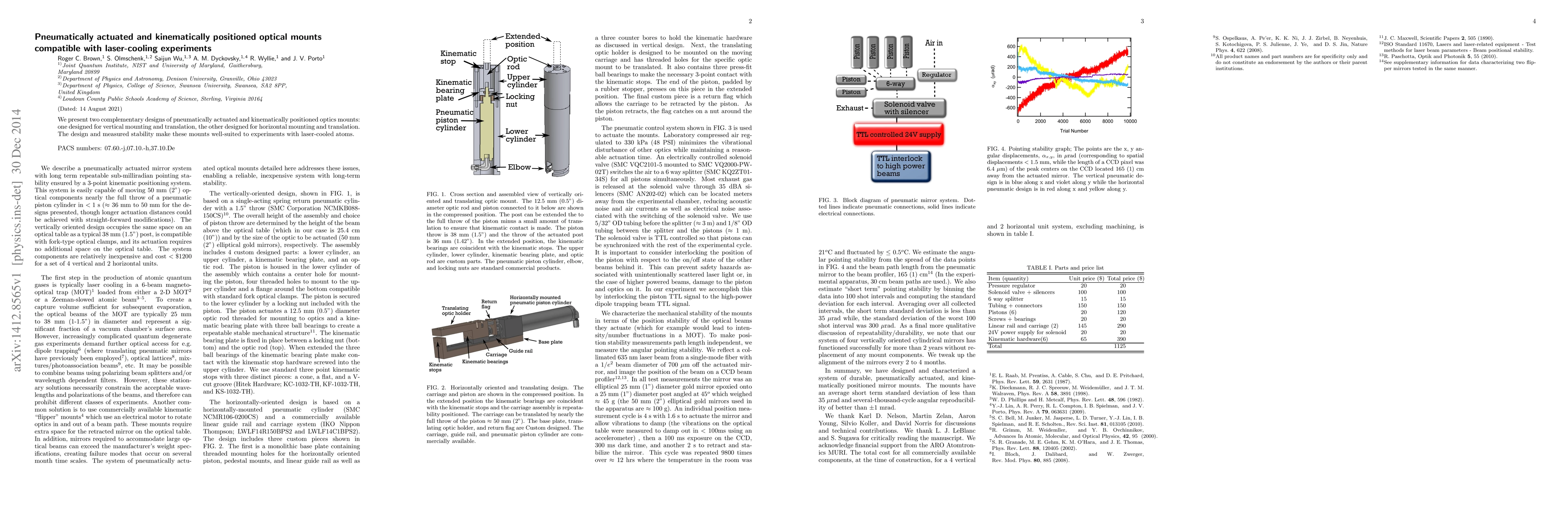 Summary: This paper introduces two pneumatically actuated optical mounts designed for vertical and horizontal laser-cooling experiments, emphasizing their kinematic positioning and stability. These mounts are tailored for precise laser-cooling applications involving atom manipulation.