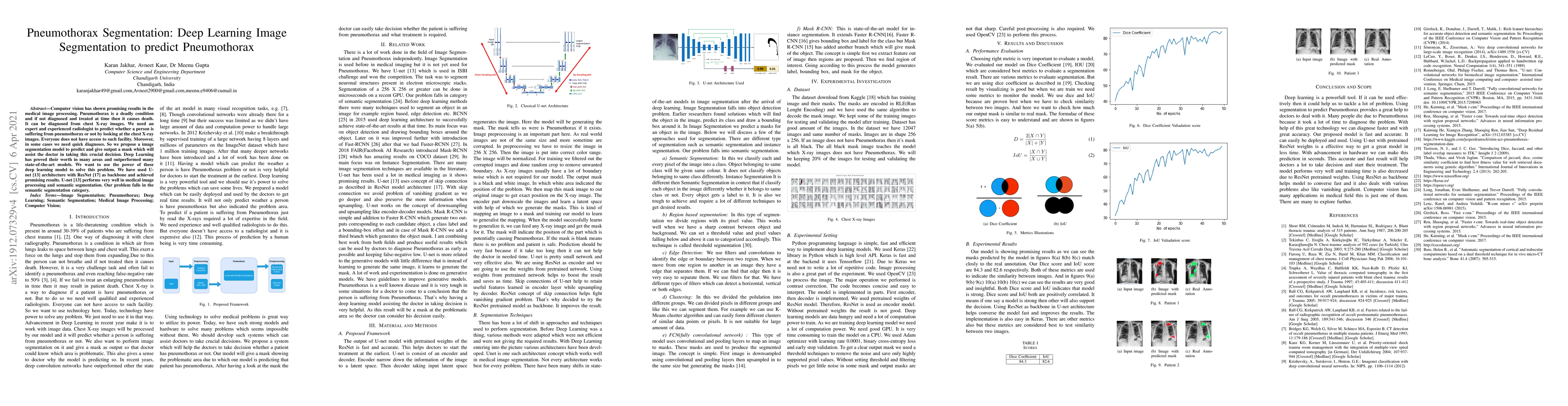 Computer vision has shown promising results in medical image processing. Pneumothorax is a deadly condition and if not diagnosed and treated at time then it causes death. It can be diagnosed with chest X-ray images. We need an expert and experienced radiologist to predict whether a person is suffering from pneumothorax or not by looking at the chest X-ray images. Everyone does not have access to such a facility. Moreover, in some cases, we need quick diagnoses. So we propose an image segmentation model to predict and give the output a mask that will assist the doctor in taking this crucial decision. Deep Learning has proved their worth in many areas and outperformed man state-of-the-art models. We want to use the power of these deep learning model to solve this problem. We have used U-net [13] architecture with ResNet [17] as a backbone and achieved promising results. U-net [13] performs very well in medical image processing and semantic segmentation. Our problem falls in the semantic segmentation category.