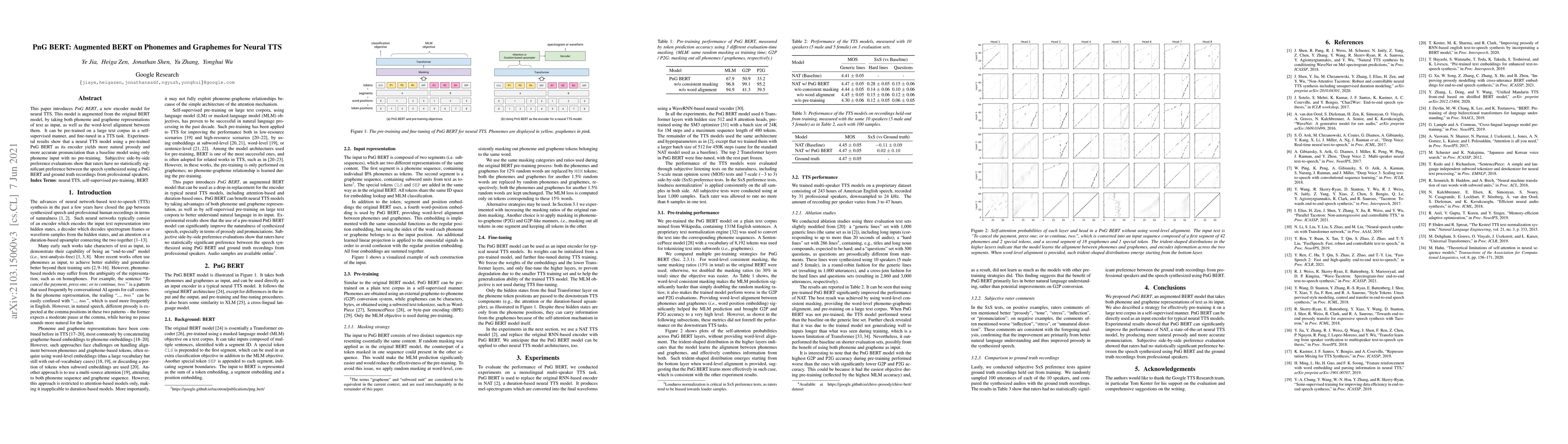 The paper introduces PnG BERT, an augmented BERT model for neural TTS that incorporates both phoneme and grapheme inputs, achieving more natural prosody and accurate pronunciation compared to baseline models. Subjective evaluations indicate no significant preference over professional recordings.