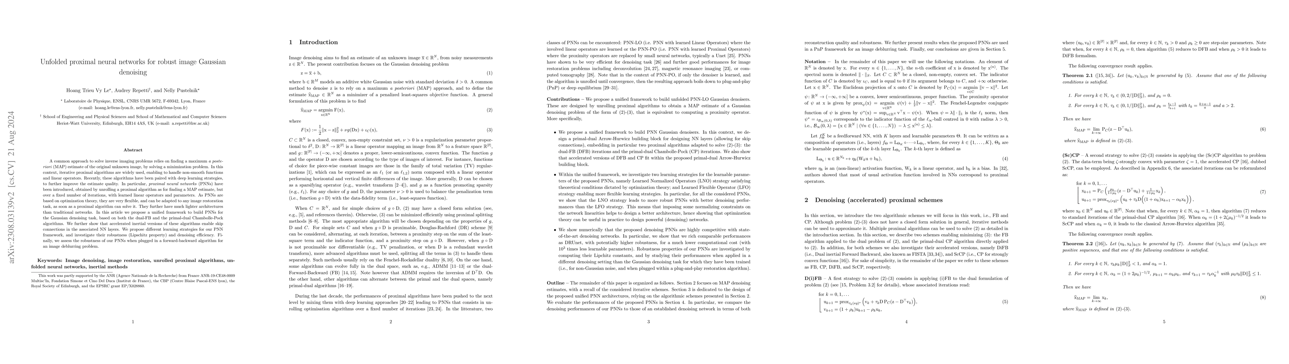 A common approach to solve inverse imaging problems relies on finding a maximum a posteriori (MAP) estimate of the original unknown image, by solving a minimization problem. In thiscontext, iterative proximal algorithms are widely used, enabling to handle non-smooth functions and linear operators. Recently, these algorithms have been paired with deep learning strategies, to further improve the estimate quality. In particular, proximal neural networks (PNNs) have been introduced, obtained by unrolling a proximal algorithm as for finding a MAP estimate, but over a fixed number of iterations, with learned linear operators and parameters. As PNNs are based on optimization theory, they are very flexible, and can be adapted to any image restoration task, as soon as a proximal algorithm can solve it. They further have much lighter architectures than traditional networks. In this article we propose a unified framework to build PNNs for the Gaussian denoising task, based on both the dual-FB and the primal-dual Chambolle-Pock algorithms. We further show that accelerated inertial versions of these algorithms enable skip connections in the associated NN layers. We propose different learning strategies for our PNN framework, and investigate their robustness (Lipschitz property) and denoising efficiency. Finally, we assess the robustness of our PNNs when plugged in a forward-backward algorithm for an image deblurring problem.