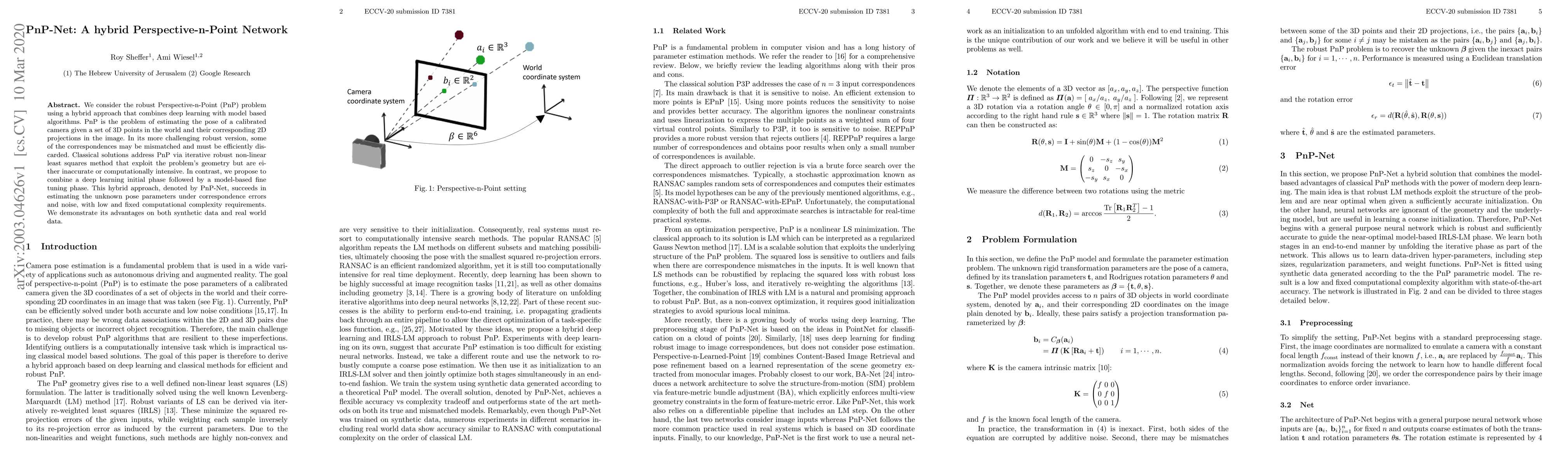 PnP-Net is a hybrid method combining deep learning and model-based algorithms to tackle the robust Perspective-n-Point (PnP) problem. It outperforms classical solutions by efficiently estimating camera pose from 3D-to-2D correspondences with lower computational complexity and improved accuracy.