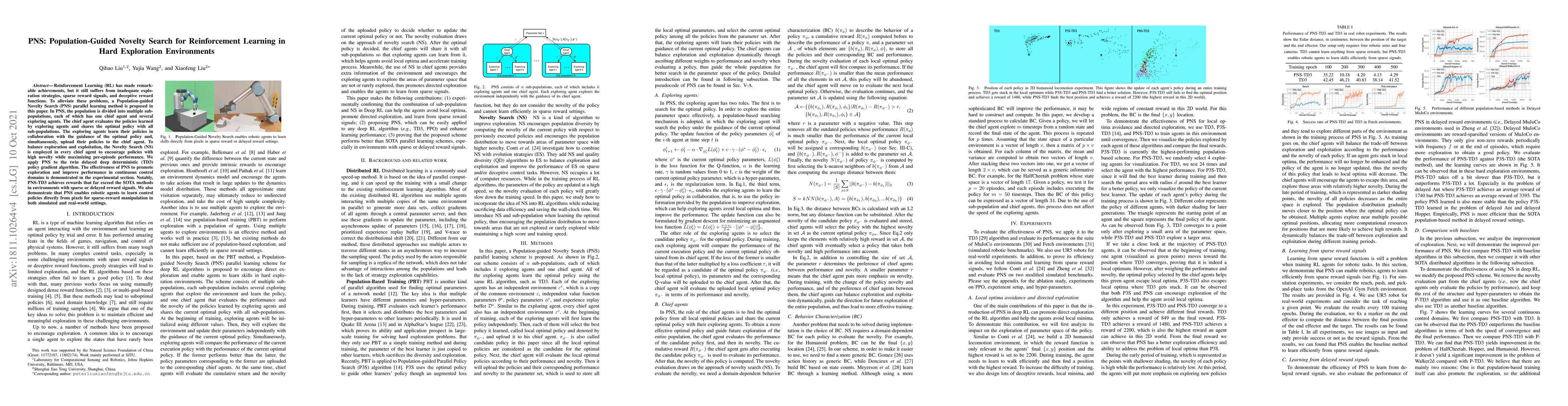 Reinforcement Learning (RL) has made remarkable achievements, but it still suffers from inadequate exploration strategies, sparse reward signals, and deceptive reward functions. To alleviate these problems, a Population-guided Novelty Search (PNS) parallel learning method is proposed in this paper. In PNS, the population is divided into multiple sub-populations, each of which has one chief agent and several exploring agents. The chief agent evaluates the policies learned by exploring agents and shares the optimal policy with all sub-populations. The exploring agents learn their policies in collaboration with the guidance of the optimal policy and, simultaneously, upload their policies to the chief agent. To balance exploration and exploitation, the Novelty Search (NS) is employed in every chief agent to encourage policies with high novelty while maximizing per-episode performance. We apply PNS to the twin delayed deep deterministic (TD3) policy gradient algorithm. The effectiveness of PNS to promote exploration and improve performance in continuous control domains is demonstrated in the experimental section. Notably, PNS-TD3 achieves rewards that far exceed the SOTA methods in environments with sparse or delayed reward signals. We also demonstrate that PNS enables robotic agents to learn control policies directly from pixels for sparse-reward manipulation in both simulated and real-world settings.
