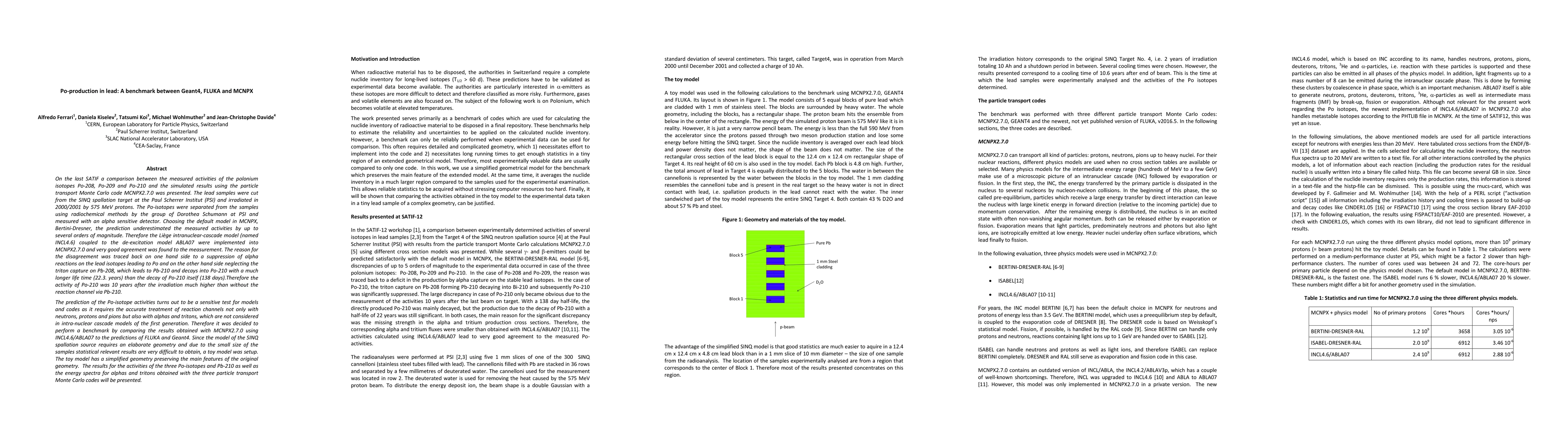 On the last SATIF a comparison between the measured activities of the polonium isotopes Po-208, Po-209 and Po-210 and the simulated results using MCNPX2.7.0 was presented. The lead samples were cut from the SINQ spallation target at the Paul Scherrer Institut (PSI) and irradiated in 2000/2001 by 575 MeV protons. The Po-isotopes were separated using radiochemical methods by the group of D. Schumann at PSI and measured. Choosing the default model in MCNPX, Bertini-Dresner, the prediction underestimated the measured activities by up to several orders of magnitude. Therefore the Li\`ege intranuclear-cascade model (INCL4.6) coupled to the de-excitation model ABLA07 were implemented into MCNPX2.7.0 and very good agreement was found to the measurement. The reason for the disagreement was traced back to a suppression of alpha reactions on the lead isotopes leading to Po and neglecting the triton capture on Pb-208, which leads to Pb-210 and decays into Po-210 with a much longer life time (22.3 years) than the decay of Po-210 itself (138 days). The prediction of the Po-isotope activities turns out to be a sensitive test for models and codes as it requires the accurate treatment of reaction channels not only with neutrons, protons and pions but also with alphas and tritons, which are not considered in intra-nuclear cascade models of the first generation. Therefore it was decided to perform a benchmark by comparing the results obtained with MCNPX2.7.0 using INCL4.6/ABLA07 to the predictions of FLUKA and Geant4. Since the model of the SINQ spallation source requires an elaborate geometry a toy model was setup. The toy model has a simplified geometry preserving the main features of the original geometry. The results for the activities of the three Po-isotopes and Pb-210 as well as the energy spectra for alphas and tritons obtained with the three particle transport Monte Carlo codes are presented.