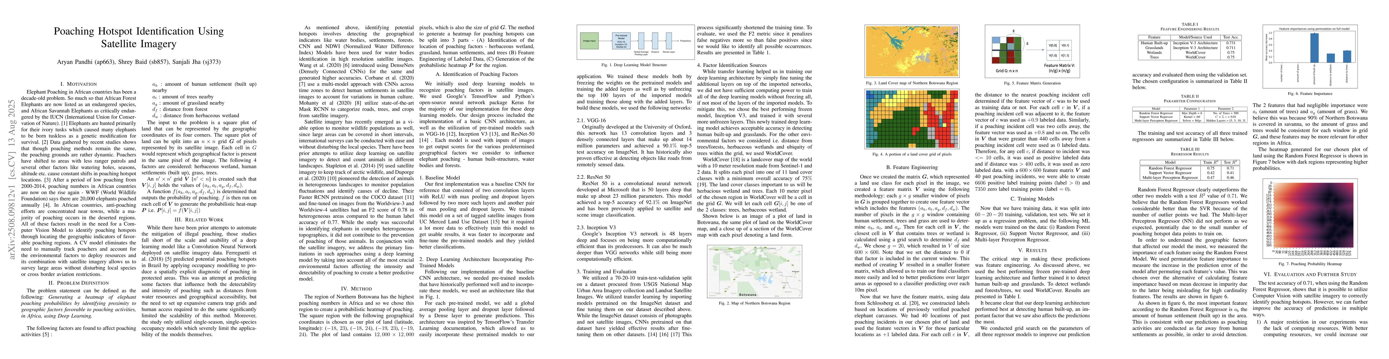 Elephant Poaching in African countries has been a decade-old problem. So much so that African Forest Elephants are now listed as an endangered species, and African Savannah Elephants as critically endangered by the IUCN (International Union for Conservation of Nature). [1] Elephants are hunted primarily for their ivory tusks which caused many elephants to be born tuskless as a genetic modification for survival. [2] Data gathered by recent studies shows that though poaching methods remain the same, the poaching grounds are rather dynamic. Poachers have shifted to areas with less ranger patrols and several other factors like watering holes, seasons, altitude etc. cause constant shifts in poaching hotspot locations. [3] After a period of low poaching from 2000-2014, poaching numbers in African countries are now on the rise again -- WWF (World Wildlife Foundation) says there are 20,000 elephants poached annually [4]. In African countries, anti-poaching efforts are concentrated near towns, while a majority of poaching occurs in the deserted regions. All of these factors result in the need for a Computer Vision Model to identify poaching hotspots through locating the geographic indicators of favorable poaching regions. A CV model eliminates the need to manually track poachers and account for the environmental factors to deploy resources and its combination with satellite imagery allows us to survey large areas without disturbing local species or cross border aviation restrictions.