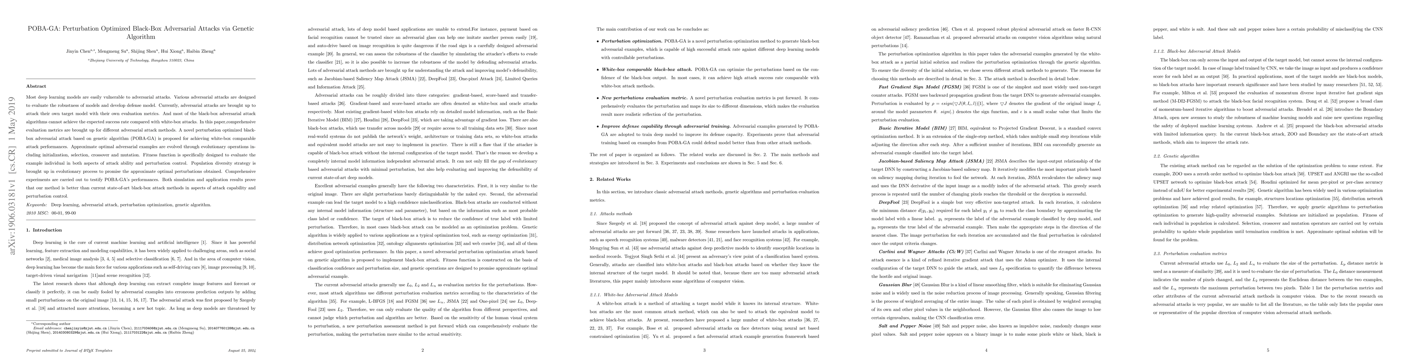 Most deep learning models are easily vulnerable to adversarial attacks. Various adversarial attacks are designed to evaluate the robustness of models and develop defense model. Currently, adversarial attacks are brought up to attack their own target model with their own evaluation metrics. And most of the black-box adversarial attack algorithms cannot achieve the expected success rate compared with white-box attacks. In this paper, comprehensive evaluation metrics are brought up for different adversarial attack methods. A novel perturbation optimized black-box adversarial attack based on genetic algorithm (POBA-GA) is proposed for achieving white-box comparable attack performances. Approximate optimal adversarial examples are evolved through evolutionary operations including initialization, selection, crossover and mutation. Fitness function is specifically designed to evaluate the example individual in both aspects of attack ability and perturbation control. Population diversity strategy is brought up in evolutionary process to promise the approximate optimal perturbations obtained. Comprehensive experiments are carried out to testify POBA-GA's performances. Both simulation and application results prove that our method is better than current state-of-art black-box attack methods in aspects of attack capability and perturbation control.