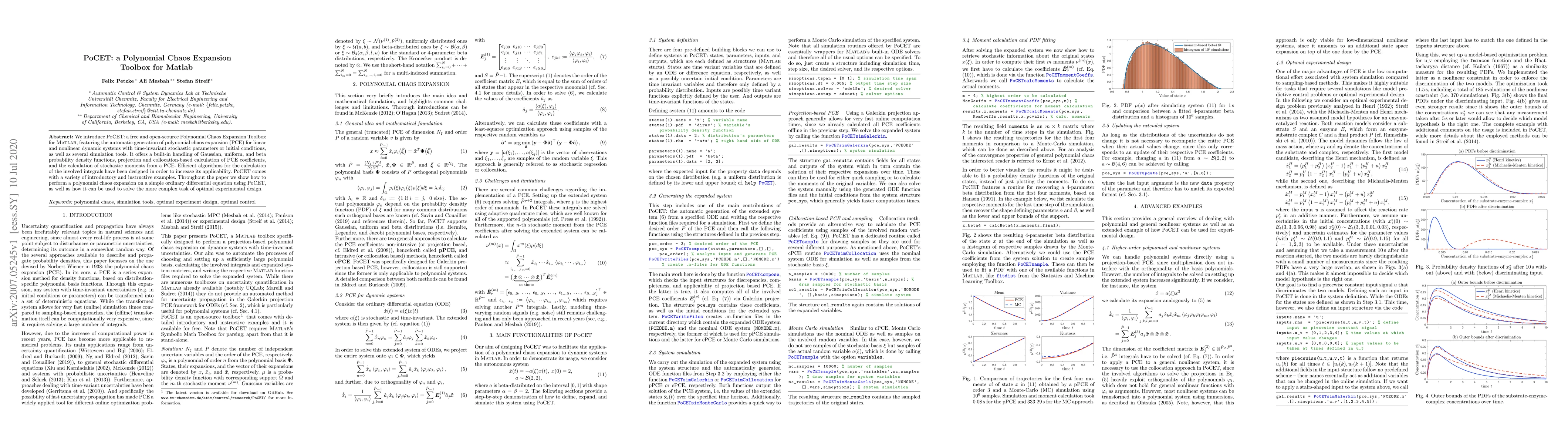 PoCET is a free and open-source Polynomial Chaos Expansion (PCE) Toolbox for Matlab, designed for automatic generation of PCE for linear and nonlinear dynamic systems with stochastic parameters or initial conditions. It supports Gaussian, uniform, and beta probability density functions, and offers efficient algorithms for integral calculations.