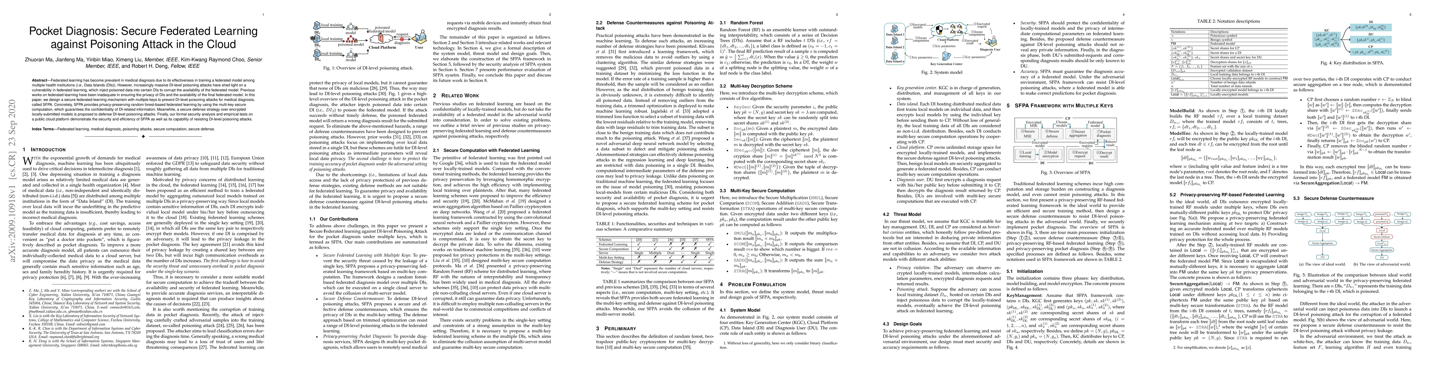 This paper proposes SFPA, a secure federated learning mechanism to defend against DI-level poisoning attacks in medical diagnosis, utilizing multi-key secure computation and a defense strategy over encrypted models to ensure data confidentiality and model availability. Empirical tests confirm its effectiveness and efficiency.