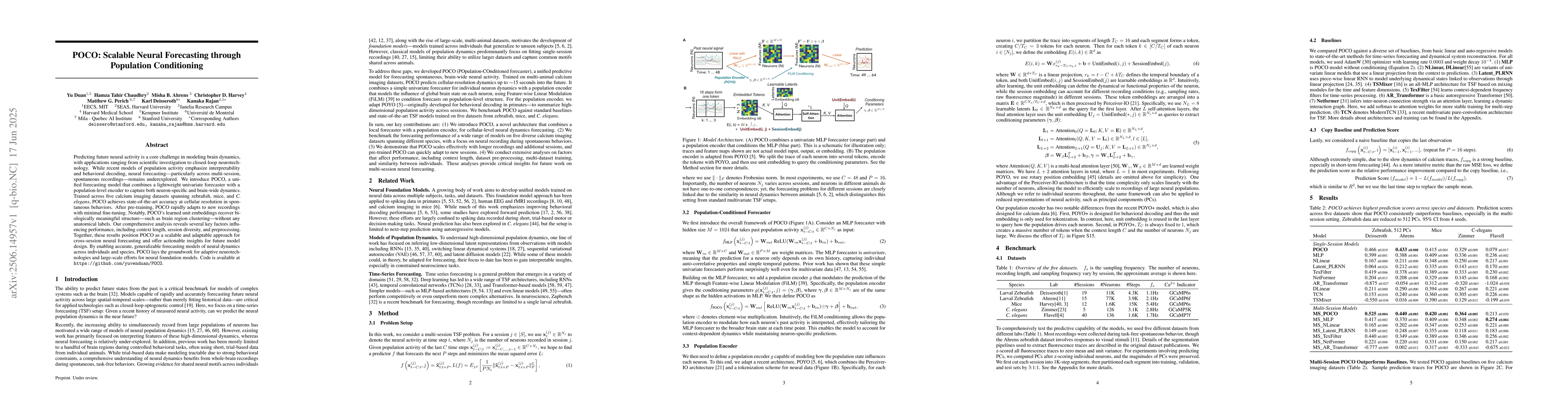 Predicting future neural activity is a core challenge in modeling brain dynamics, with applications ranging from scientific investigation to closed-loop neurotechnology. While recent models of population activity emphasize interpretability and behavioral decoding, neural forecasting-particularly across multi-session, spontaneous recordings-remains underexplored. We introduce POCO, a unified forecasting model that combines a lightweight univariate forecaster with a population-level encoder to capture both neuron-specific and brain-wide dynamics. Trained across five calcium imaging datasets spanning zebrafish, mice, and C. elegans, POCO achieves state-of-the-art accuracy at cellular resolution in spontaneous behaviors. After pre-training, POCO rapidly adapts to new recordings with minimal fine-tuning. Notably, POCO's learned unit embeddings recover biologically meaningful structure-such as brain region clustering-without any anatomical labels. Our comprehensive analysis reveals several key factors influencing performance, including context length, session diversity, and preprocessing. Together, these results position POCO as a scalable and adaptable approach for cross-session neural forecasting and offer actionable insights for future model design. By enabling accurate, generalizable forecasting models of neural dynamics across individuals and species, POCO lays the groundwork for adaptive neurotechnologies and large-scale efforts for neural foundation models.