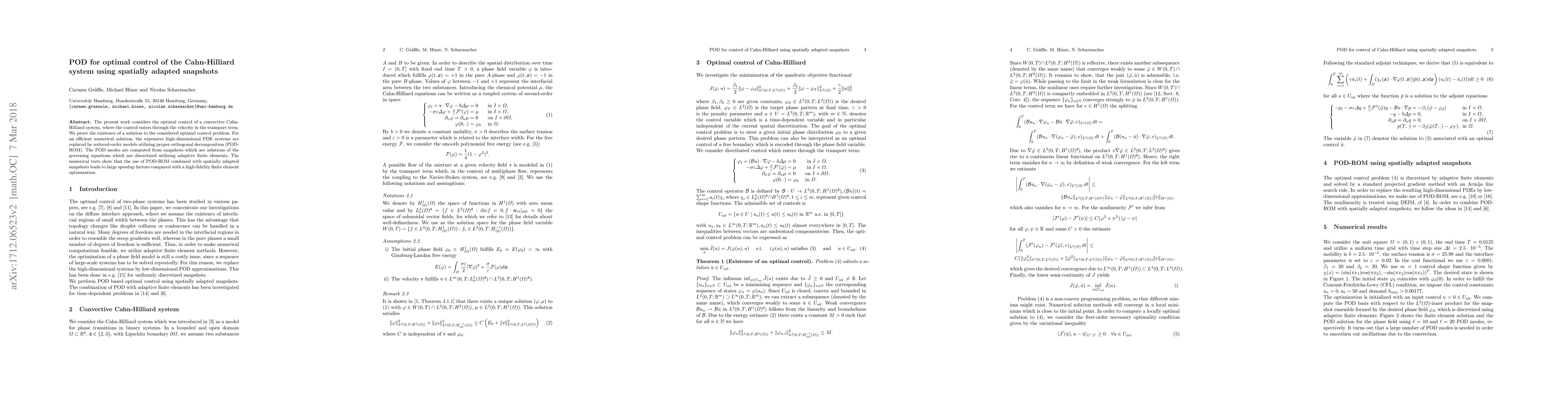 This paper investigates optimal control of a convective Cahn-Hilliard system using proper orthogonal decomposition (POD) for reduced-order modeling (POD-ROM). The POD modes are derived from spatially adapted snapshots, leading to significant computational efficiency compared to high-fidelity finite element methods.
