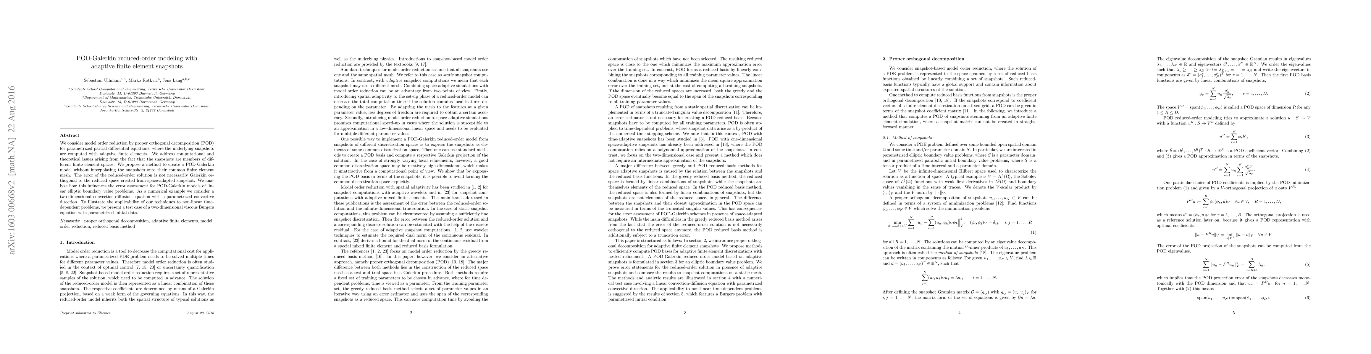 We consider model order reduction by proper orthogonal decomposition (POD) for parametrized partial differential equations, where the underlying snapshots are computed with adaptive finite elements. We address computational and theoretical issues arising from the fact that the snapshots are members of different finite element spaces. We propose a method to create a POD-Galerkin model without interpolating the snapshots onto their common finite element mesh. The error of the reduced-order solution is not necessarily Galerkin orthogonal to the reduced space created from space-adapted snapshot. We analyze how this influences the error assessment for POD-Galerkin models of linear elliptic boundary value problems. As a numerical example we consider a two-dimensional convection-diffusion equation with a parametrized convective direction. To illustrate the applicability of our techniques to non-linear time-dependent problems, we present a test case of a two-dimensional viscous Burgers equation with parametrized initial data.