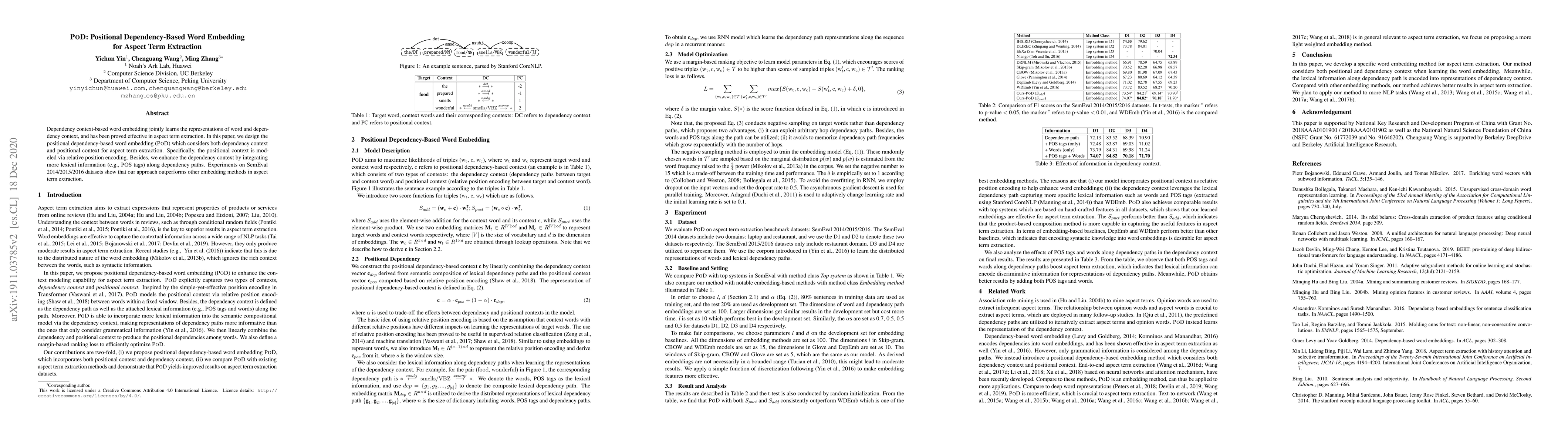 This paper introduces PoD, a positional dependency-based word embedding that combines dependency and positional context for aspect term extraction, enhancing dependency context with lexical information. Experimental results on SemEval datasets demonstrate its superior performance over other methods.