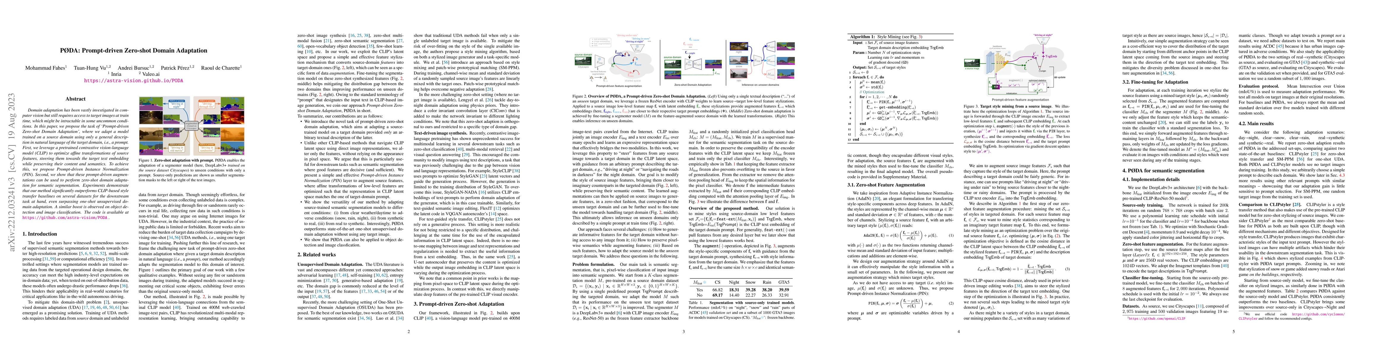 This paper introduces "Prompt-driven Zero-shot Domain Adaptation" to adapt models trained on source domains to target domains using only natural language descriptions. It leverages CLIP and proposes Prompt-driven Instance Normalization (PIN) to achieve this, significantly outperforming baselines in zero-shot domain adaptation for semantic segmentation, object detection, and image classification.