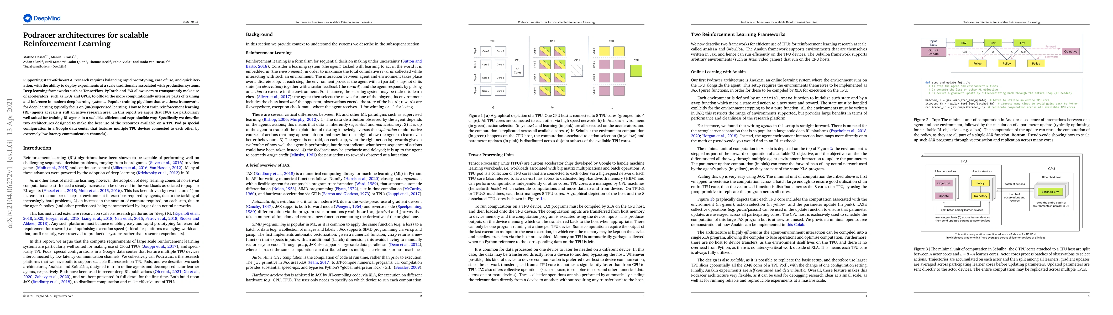 This paper explores scalable reinforcement learning (RL) using TPU Pods, emphasizing efficient resource utilization. It introduces two architectures tailored to leverage TPU Pods' unique low-latency communication for training RL agents at scale, addressing the challenge of balancing rapid prototyping with large-scale deployment.