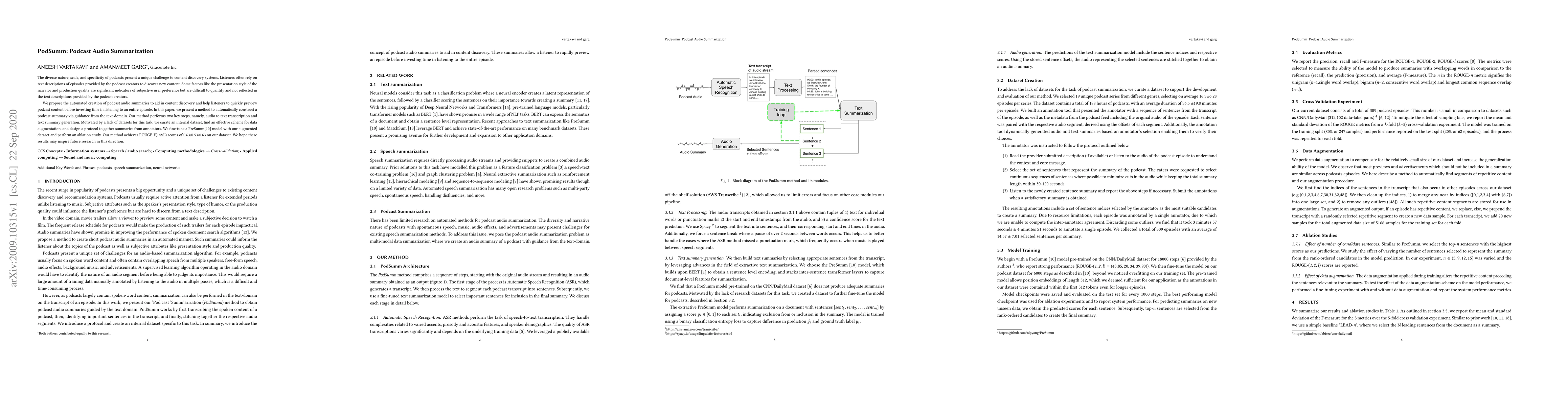 This paper proposes an automated method for generating podcast audio summaries to aid content discovery, involving audio transcription and text summary generation. The authors curate a dataset, augment it, and fine-tune a PreSumm model, achieving ROUGE scores of 0.63/0.53/0.63, aiming to inspire further research in podcast summarization.