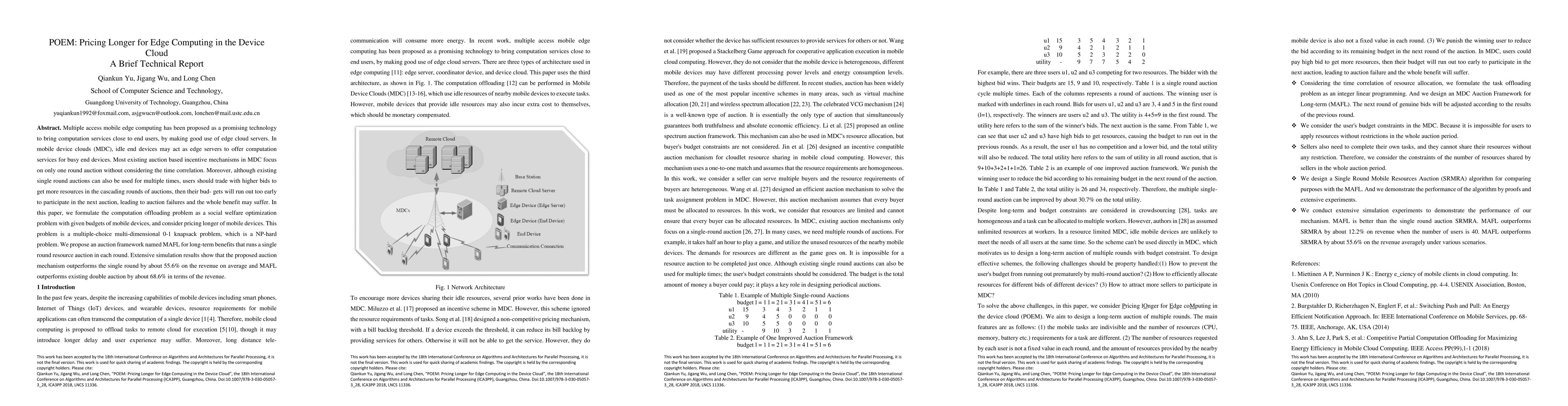 Multiple access mobile edge computing has been proposed as a promising technology to bring computation services close to end users, by making good use of edge cloud servers. In mobile device clouds (MDC), idle end devices may act as edge servers to offer computation services for busy end devices. Most existing auction based incentive mechanisms in MDC focus on only one round auction without considering the time correlation. Moreover, although existing single round auctions can also be used for multiple times, users should trade with higher bids to get more resources in the cascading rounds of auctions, then their budgets will run out too early to participate in the next auction, leading to auction failures and the whole benefit may suffer. In this paper, we formulate the computation offloading problem as a social welfare optimization problem with given budgets of mobile devices, and consider pricing longer of mobile devices. This problem is a multiple-choice multi-dimensional 0-1 knapsack problem, which is a NP-hard problem. We propose an auction framework named MAFL for long-term benefits that runs a single round resource auction in each round. Extensive simulation results show that the proposed auction mechanism outperforms the single round by about 55.6% on the revenue on average and MAFL outperforms existing double auction by about 68.6% in terms of the revenue.