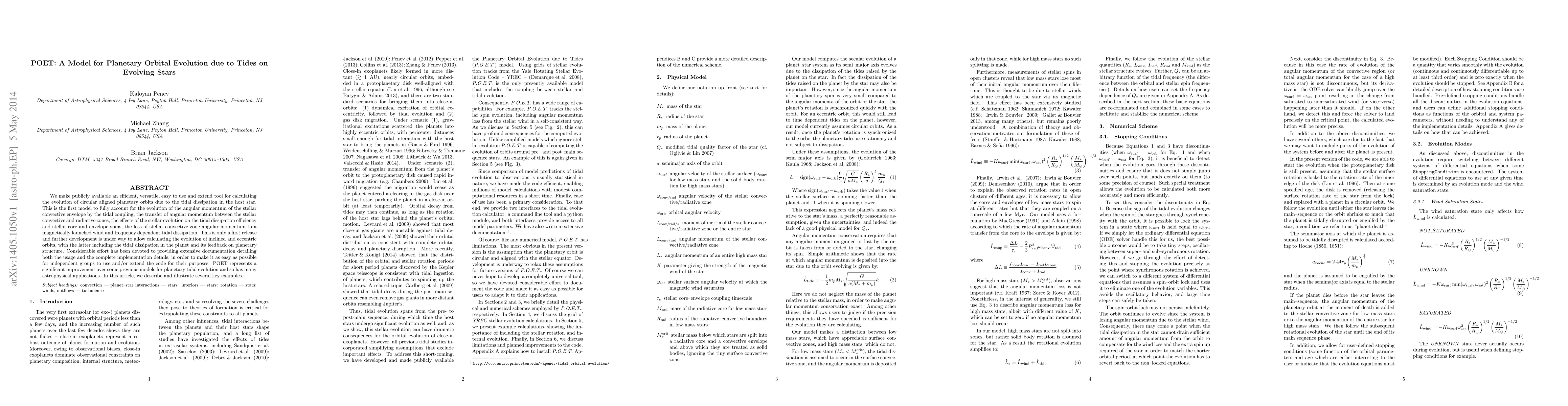 We make publicly available an efficient, versatile, easy to use and extend tool for calculating the evolution of circular aligned planetary orbits due to the tidal dissipation in the host star. This is the first model to fully account for the evolution of the angular momentum of the stellar convective envelope by the tidal coupling, the transfer of angular momentum between the stellar convective and radiative zones, the effects of the stellar evolution on the tidal dissipation efficiency and stellar core and envelope spins, the loss of stellar convective zone angular momentum to a magnetically launched wind and frequency dependent tidal dissipation. This is only a first release and further development is under way to allow calculating the evolution of inclined and eccentric orbits, with the latter including the tidal dissipation in the planet and its feedback on planetary structure. Considerable effort has been devoted to providing extensive documentation detailing both the usage and the complete implementation details, in order to make it as easy as possible for independent groups to use and/or extend the code for their purposes. POET represents a significant improvement over some previous models for planetary tidal evolution and so has many astrophysical applications. In this article, we describe and illustrate several key examples.