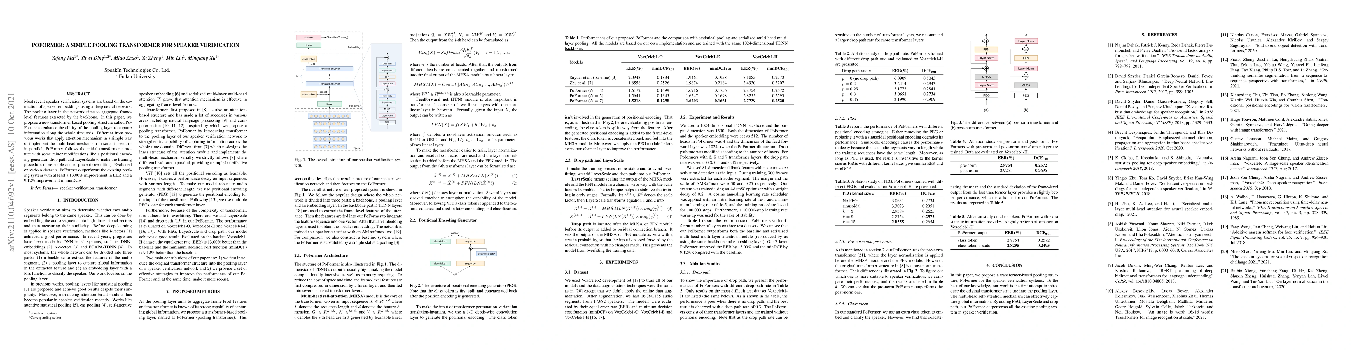 PoFormer introduces a novel pooling transformer structure to enhance speaker verification by aggregating time-axis features more effectively. It outperforms existing methods with significant improvements in Equal Error Rate (EER) and Minimum Detection Cost Function (minDCF) across multiple datasets.